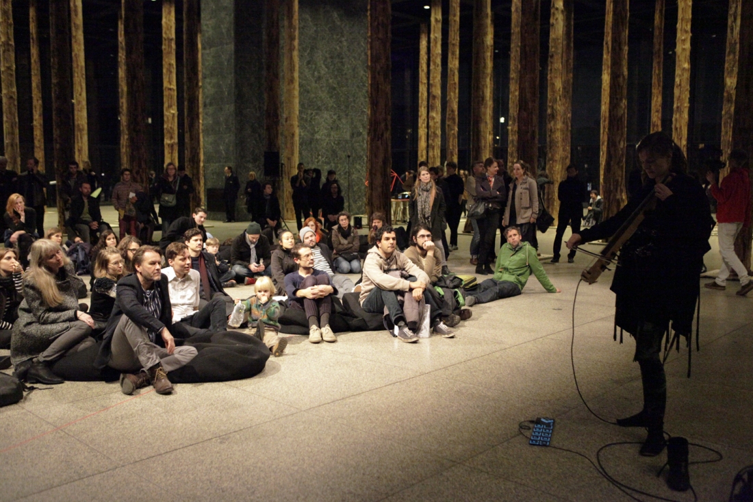 Hildur Guðnadóttir performs on an electric cello made by Hans Jóhannsson in the context of Manchester University’s department of electric and electronic engineering.