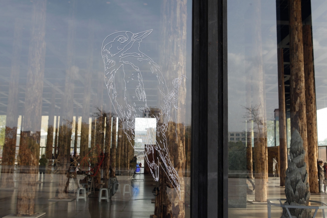 30.10 – 01.11.2014 Jonas Wendelin außen DER ARCHITEKT DES ARCHITEKTEN Holzspielzeug / Instrument, Fensterbeschriftung