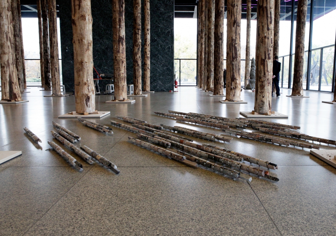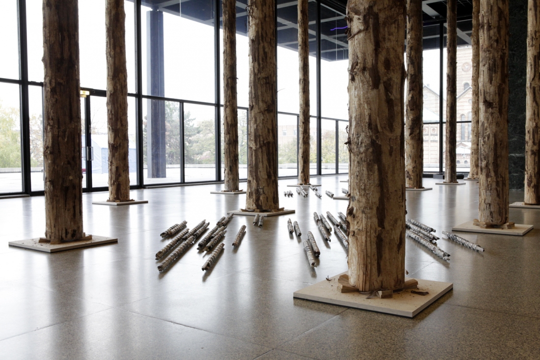 With the reassembly of these cores – and thus of the stories and the consecutive presents that they contain – time and space are mixed and compressed to form new arrangements, creating new dialogues between both geological and architectonical elements. Each sculpture functions as an avatar of a vertical geological timeline, stressing the idea of history as a human construction.