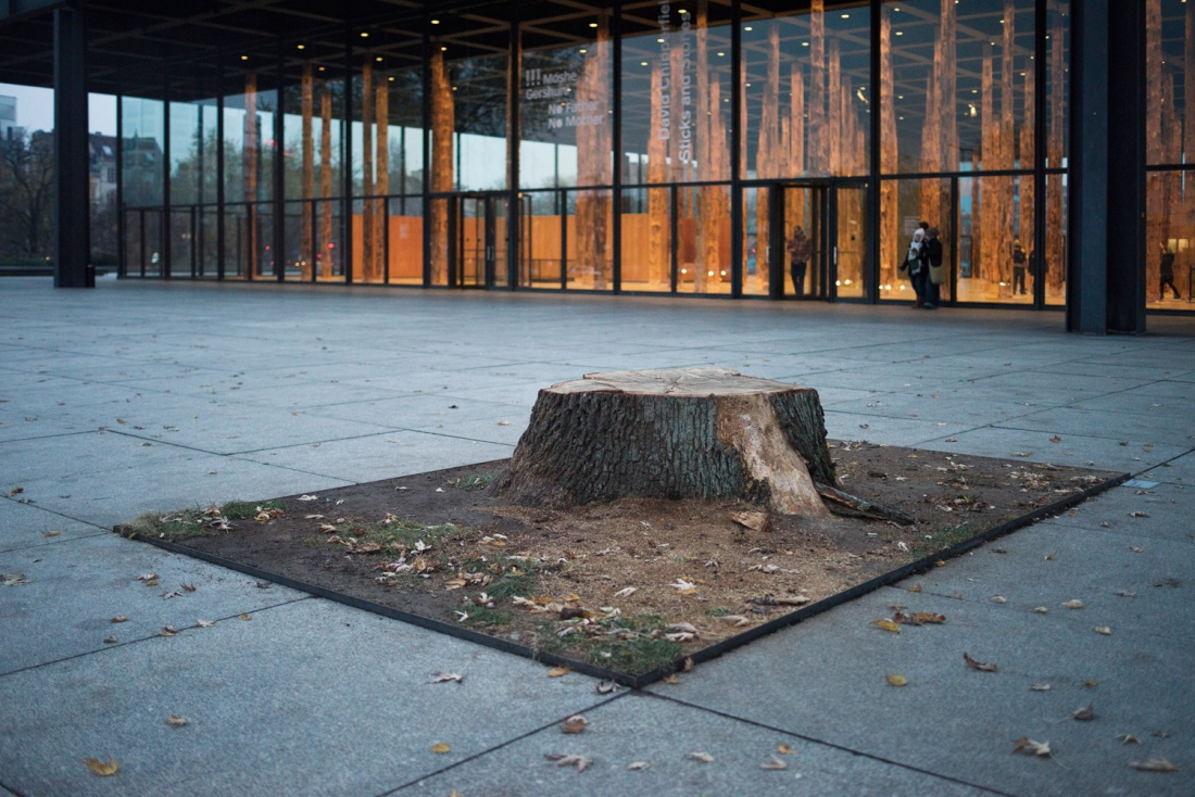 A stump of an old tree is placed on the terrace of the Neue Nationalgalerie. Suggesting that a tree once grew in that location, the stump creates a false history. Too old to actually be part of this or any modern building, the tree only exists as a sculpture in thought, in imagined space. As it takes shape in the viewer’s mind, the full, imagined tree grows into a means to falsify or write history – a fictitious or potential history. The stump is the impossible trace of an unnatural object.