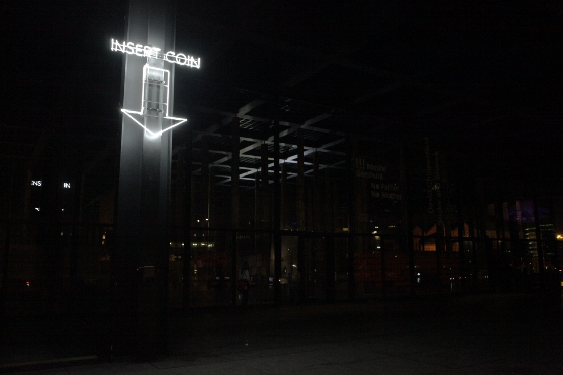 Insert Coin verwandelt die Neue Nationalgalerie in eine Art Automaten. Außerhalb der Öffnungszeiten des Museums werden Passanten durch ein Neonleuchtschild aufgefordert, einen Münzeinwurfautomaten zu bedienen.
