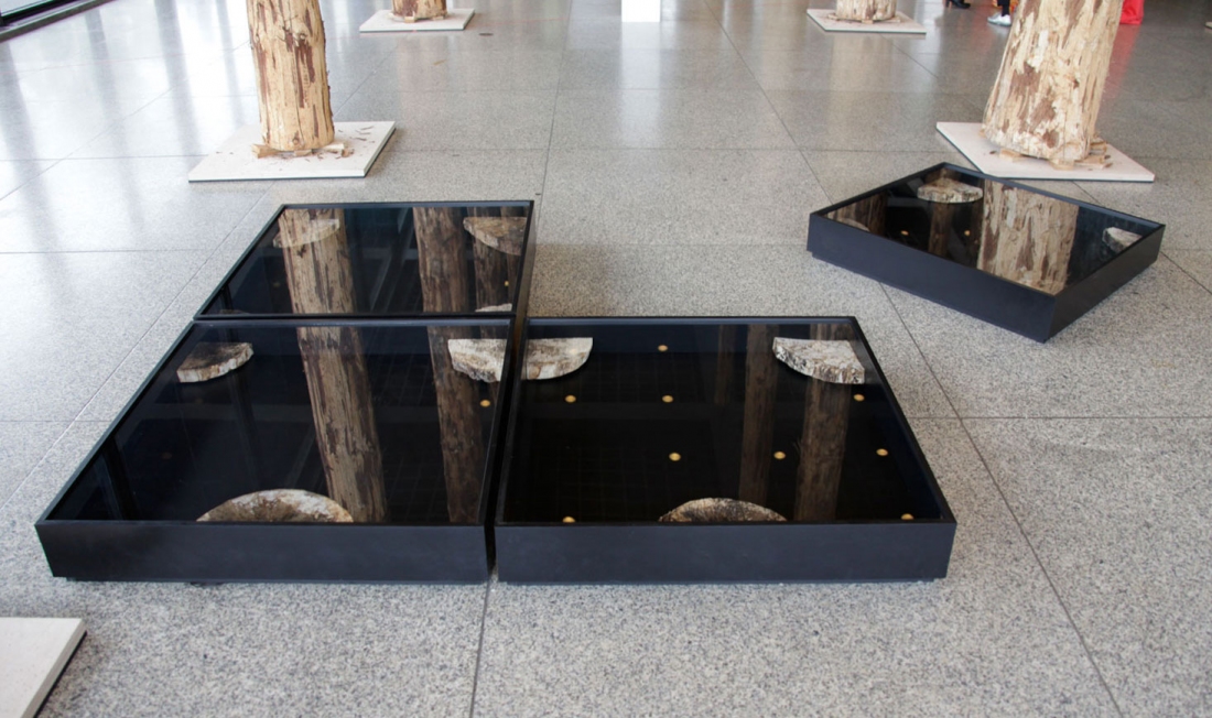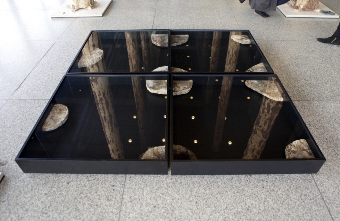 display cases, mushroom mycelium, tree slices