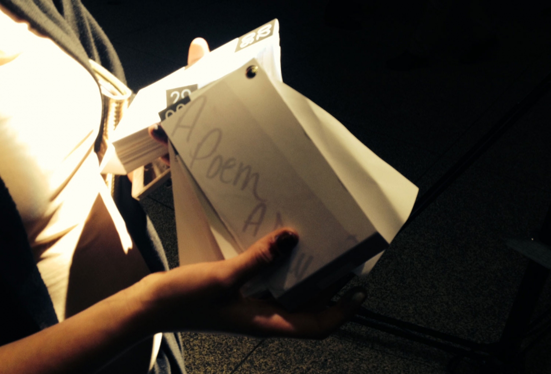 The first performance of the calendar publication project A Poem A Day, which pairs 366 poetry contributions with the 365+1 days of the year (the “extra” day being, of course, 29 February during a leap year). Visitors are invited to approach performers carrying A Poem A Day calendars and to choose a date. The corresponding poem will then be read aloud to them.