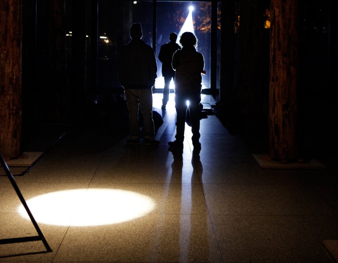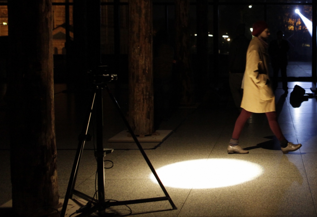 A spotlight hangs from the ceiling. It beams a cone of light onto the floor. Festival guests can stand in the spotlight.