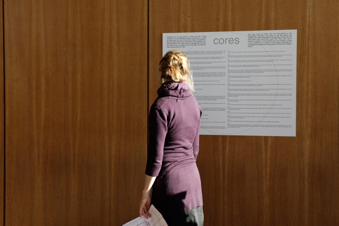 Four hundred cores will be taken from the tree trunks in David Chipperfield’s exhibition Sticks and Stones and given to the four hundred artists who participated in the activities of the Institut für Raumexperimente over the years. Each participant will then insert their “IfRex core” into a situation, a context, or an environment, give it to a person, or keep it as a memento, as a symbol of the peaceful obtainment of knowledge and experience through gentle, precise, and intelligent means.