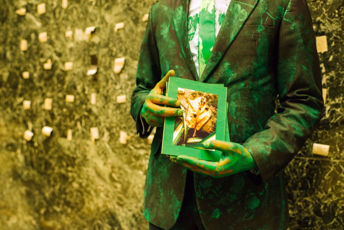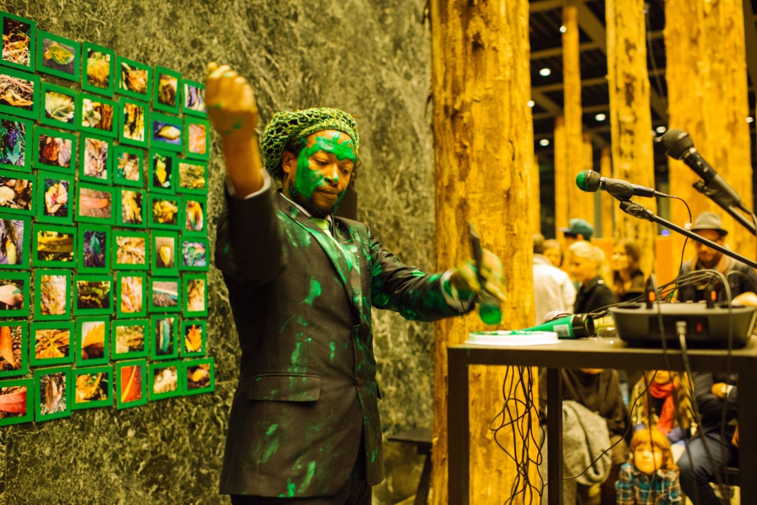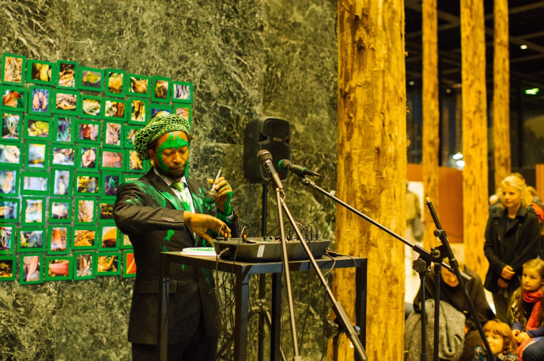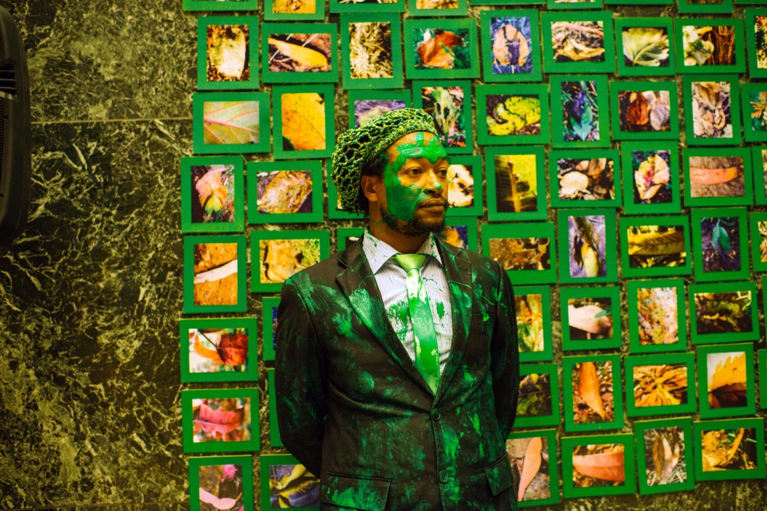 Here I stand, performing in a conceptual jungle installation, to address green notions, greening.