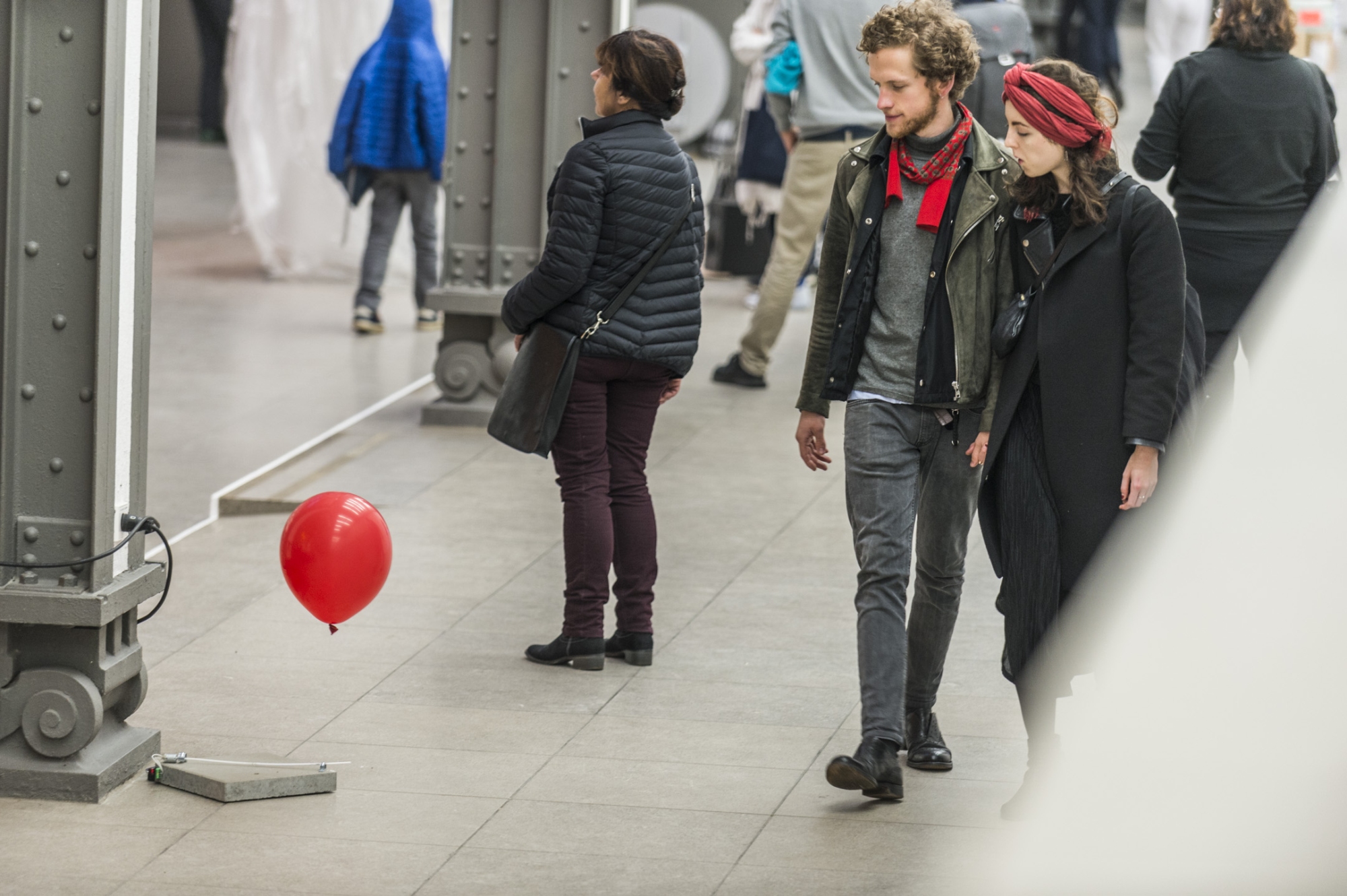 Als würden tickende Uhren und rote Fäden den Raum umspannen. Rote Heliumballons steigen in die Luft, berühren die Decke und werden wieder zurückgezogen. Jeder Ballon durchläuft den Raum in seinem eigenen Rhythmus auf eine Art und Weise, die uns selbst verwehrt ist. Der Raum wird durch diese Bewegungen erfahrbar. Die Ballons verbinden sich in ihren Flügen mit den weiteren ausgestellten Objekten, der historischen Halle und dem ganzen Museum. Die Gesten verlaufen in ständiger Synchronisation und Desynchronisation, in stetem Aufstieg und Abstieg. Sie kartieren unsichtbare Brisen und Windböen. Ein dynamischer Tanz, der nie zum Stillstand kommt. Ein Steigen und Fallen, schließlich eine Zusammenkunft.