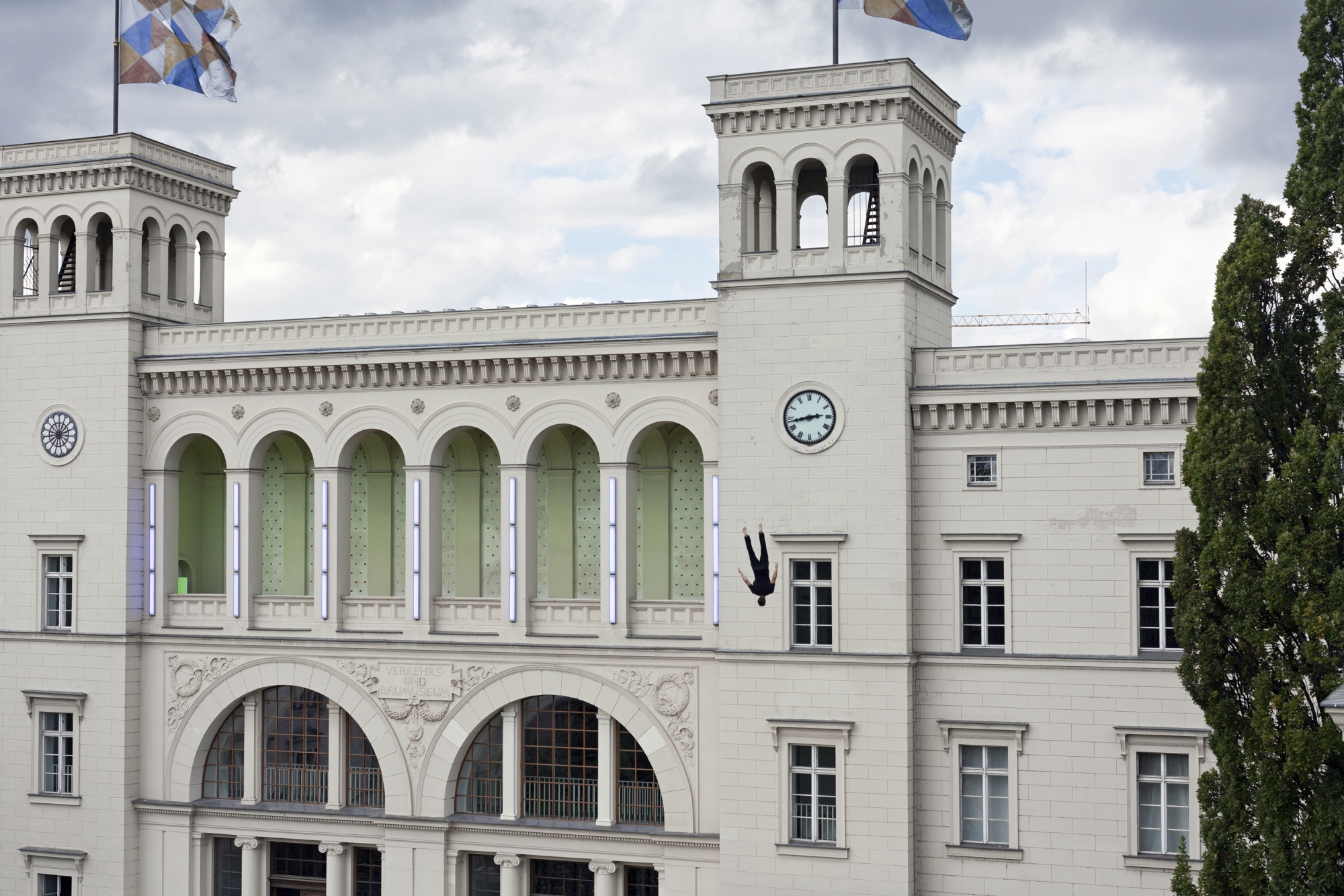 Am 16. September 2017 stürzt sich ein Mann von einem Turm. Er trägt schlichte dunkle Kleidung und keine Schuhe, fast wie ein Tänzer. Ein stürzender Körper. Ein Tanz mit der Schwerkraft. Ein Fall aus der Zeit, im Taktschlag des Glockenturms. Ein Vektor im Raum. Eine Linie zum Boden. Eine flüchtige Geste. Der Sturz eines Menschen.