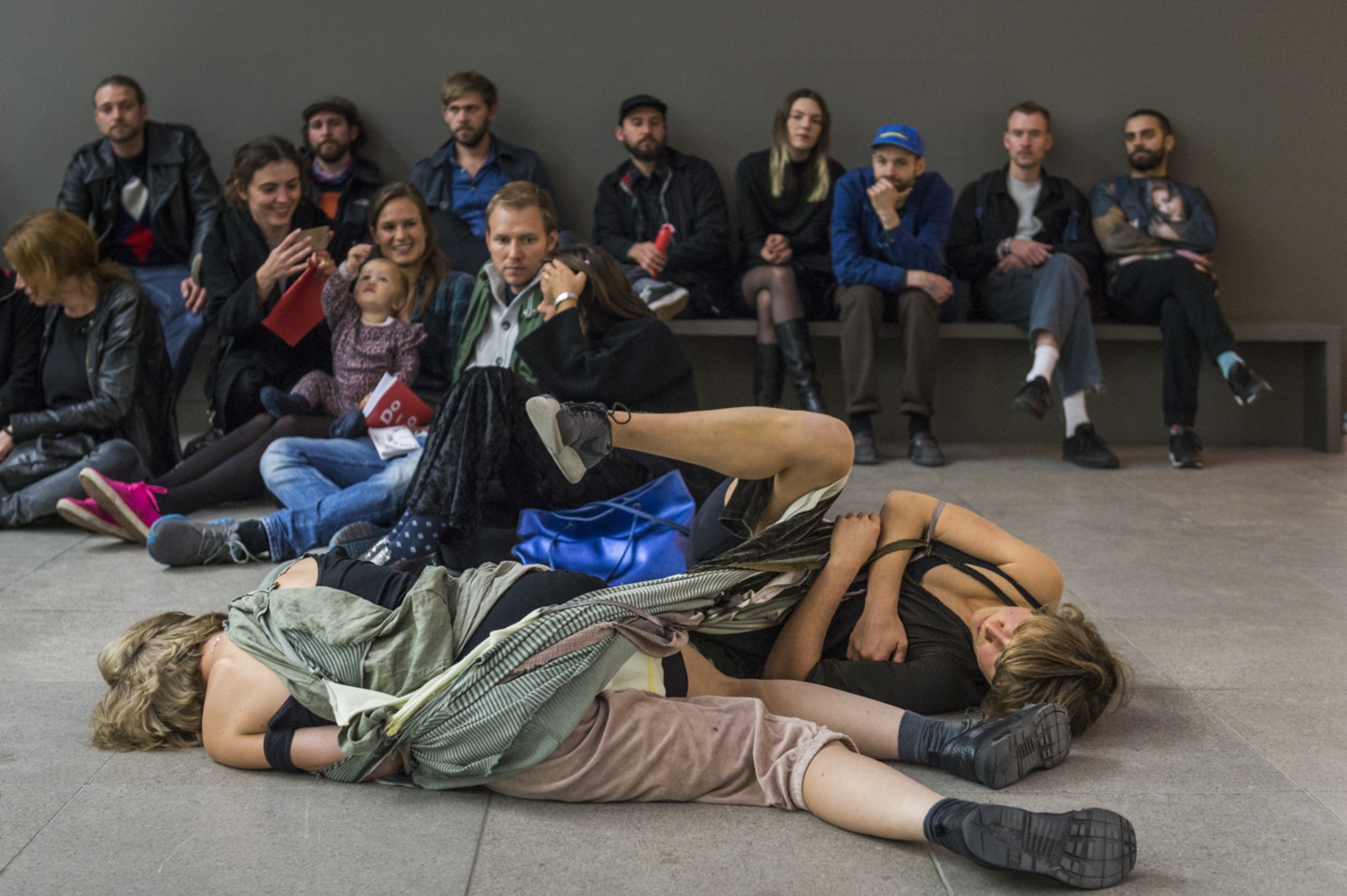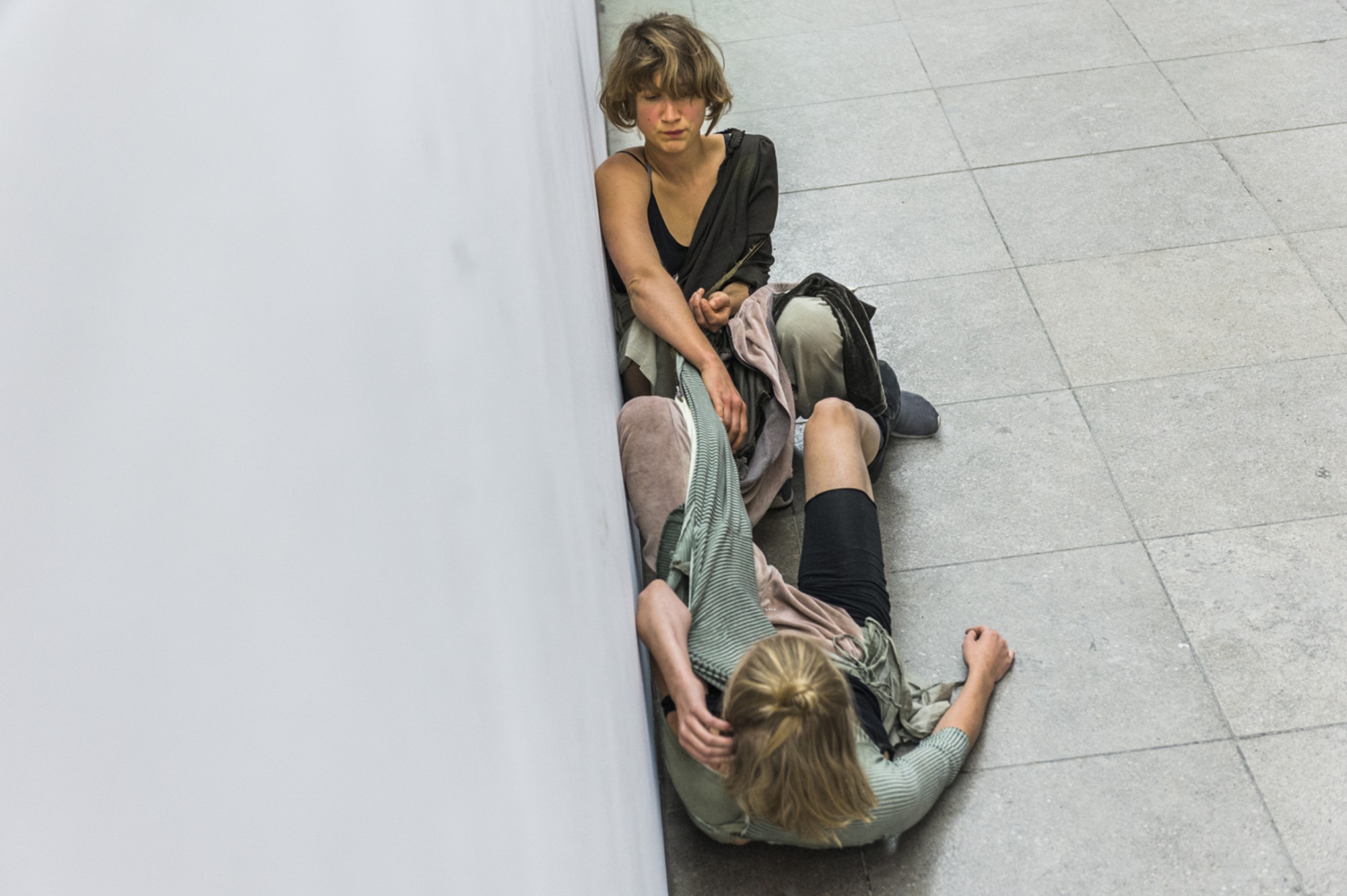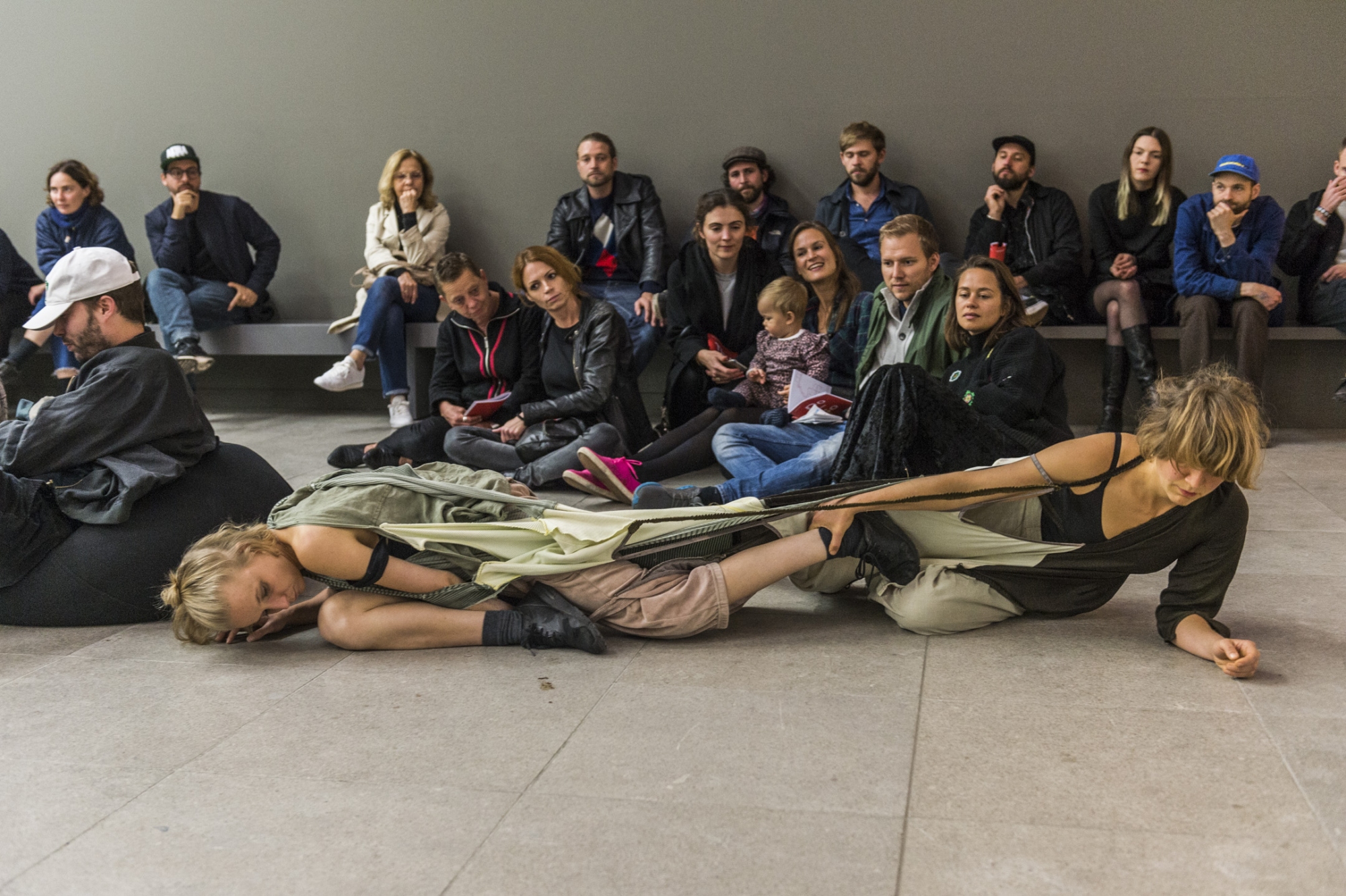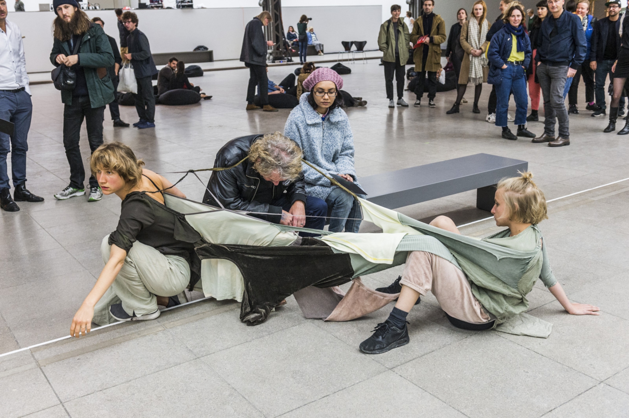 Snails work with hybrid imagery: reordering communication, interaction and gender. Snails are hermaphrodites and can switch randomly between genders, enabling a form of self-redetermination. With this in mind, the artist employs two dancers in a fluid sculpture where the boundaries between sculpture and performance dissolve. Postures of indifference and boredom are traced in contemporary movements particularly inspired by adolescents. The two performers are attached through a multi-layered garment limiting their movements and pushing them into mutual dependency. The shape formed by this garment suggests an autonomous ‘new’ body. Snails employs a fluid subjectivity, literally in constant flux, entangled in routine insignificance.