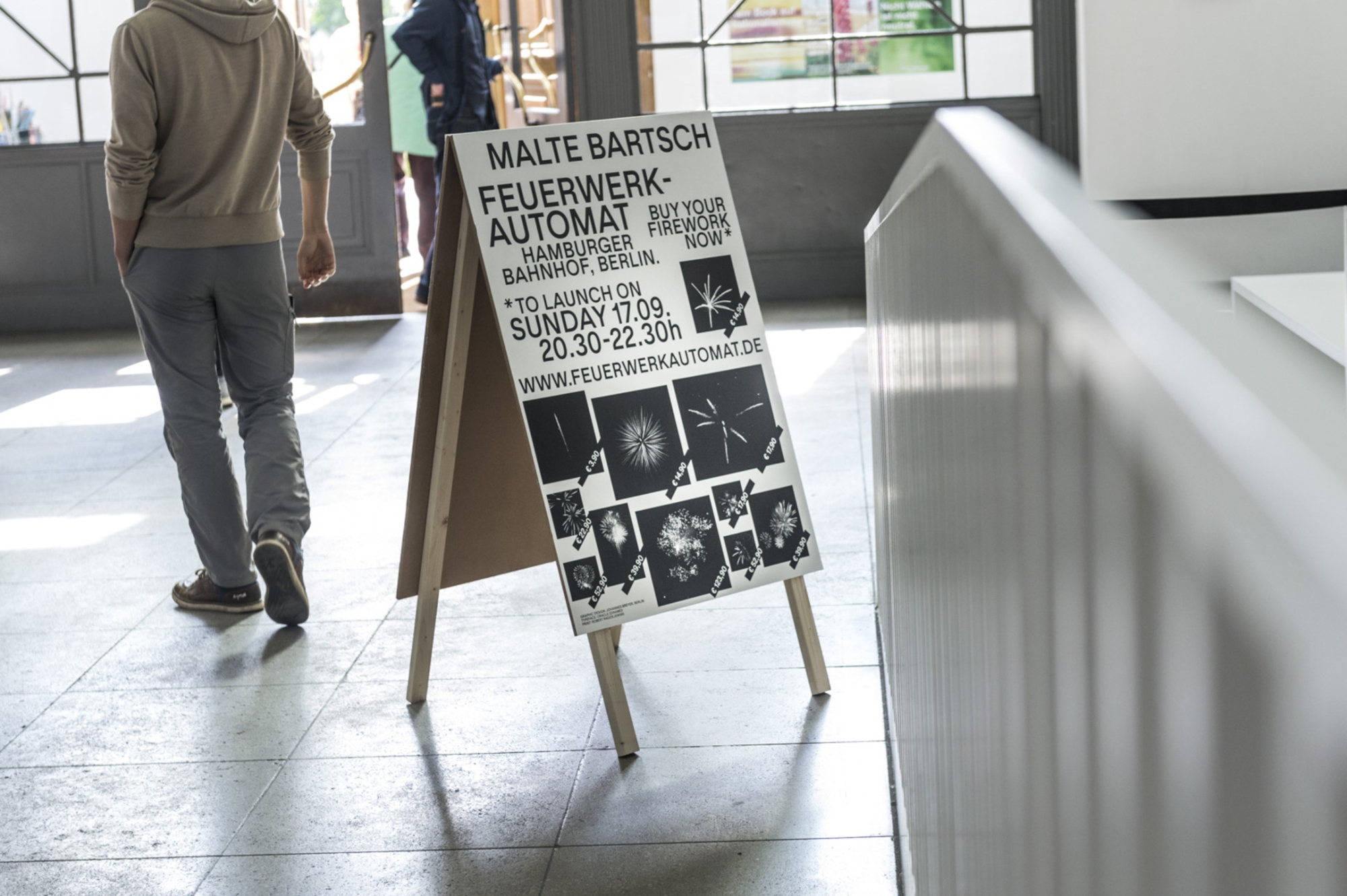 Auf dem Dach des Hamburger Bahnhofs ist eine Feuerwerkabschussstation installiert. Über den Webshop www.feuerwerkautomat.de können ab dem 14.09.2017 Feuerwerksraketen für den Abschusszeitraum von 20.30 bis 22.30 Uhr am Sonntag, den 17.09.2017, gekauft werden. Das Feuerwerk sieht man auch weit vom Museum entfernt. Das Zusehen kann nicht privatisiert werden. Wer den Abschuss einer Rakete kauft, teilt ihn mit allen anderen. Jeder kann mitmachen: eine Rakete auf dem Dach zünden lassen oder einfach vor dem Museum oder aus der Ferne das Feuerwerk beobachten. Es entsteht ein gemeinsam erlebter Moment.