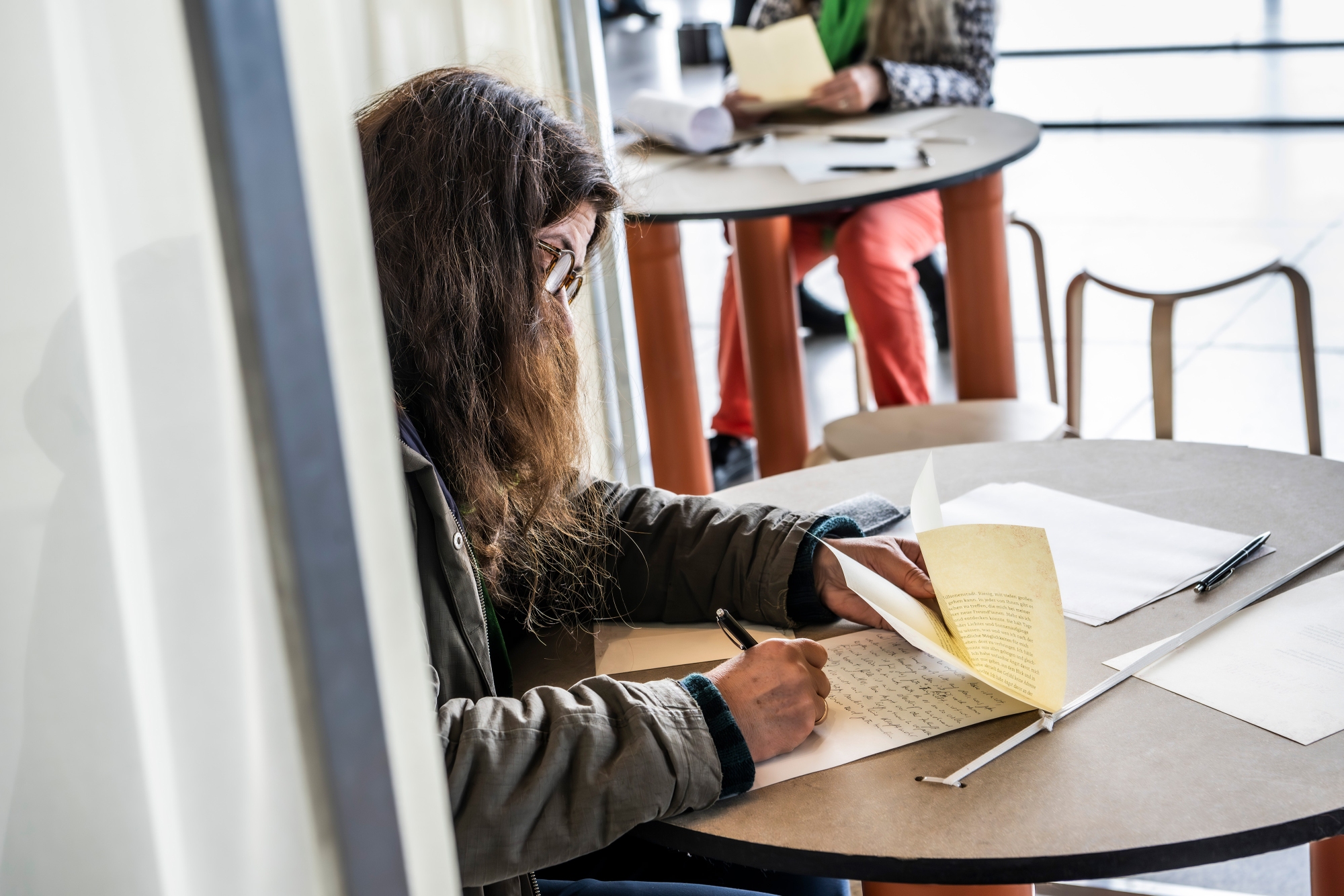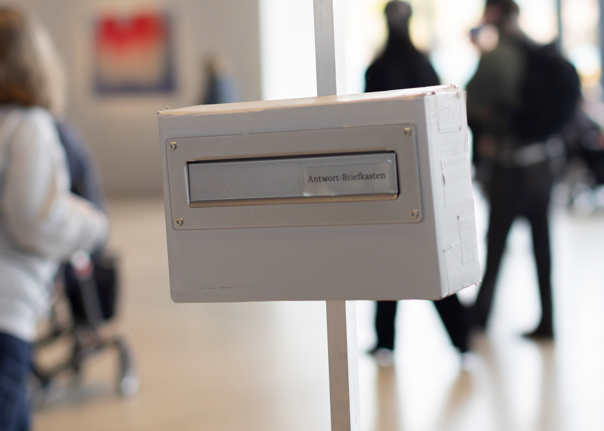 In der Neuen Nationalgalerie entsteht eine analoge Briefstation: Aus Kiel stammende Zukunftsvisionen werden thematisch sortiert. Besuchende des Festivals wählen einen Brief davon aus und schreiben eine persönliche Antwort, die später an die ursprünglichen Absender*innen zurückgeht.