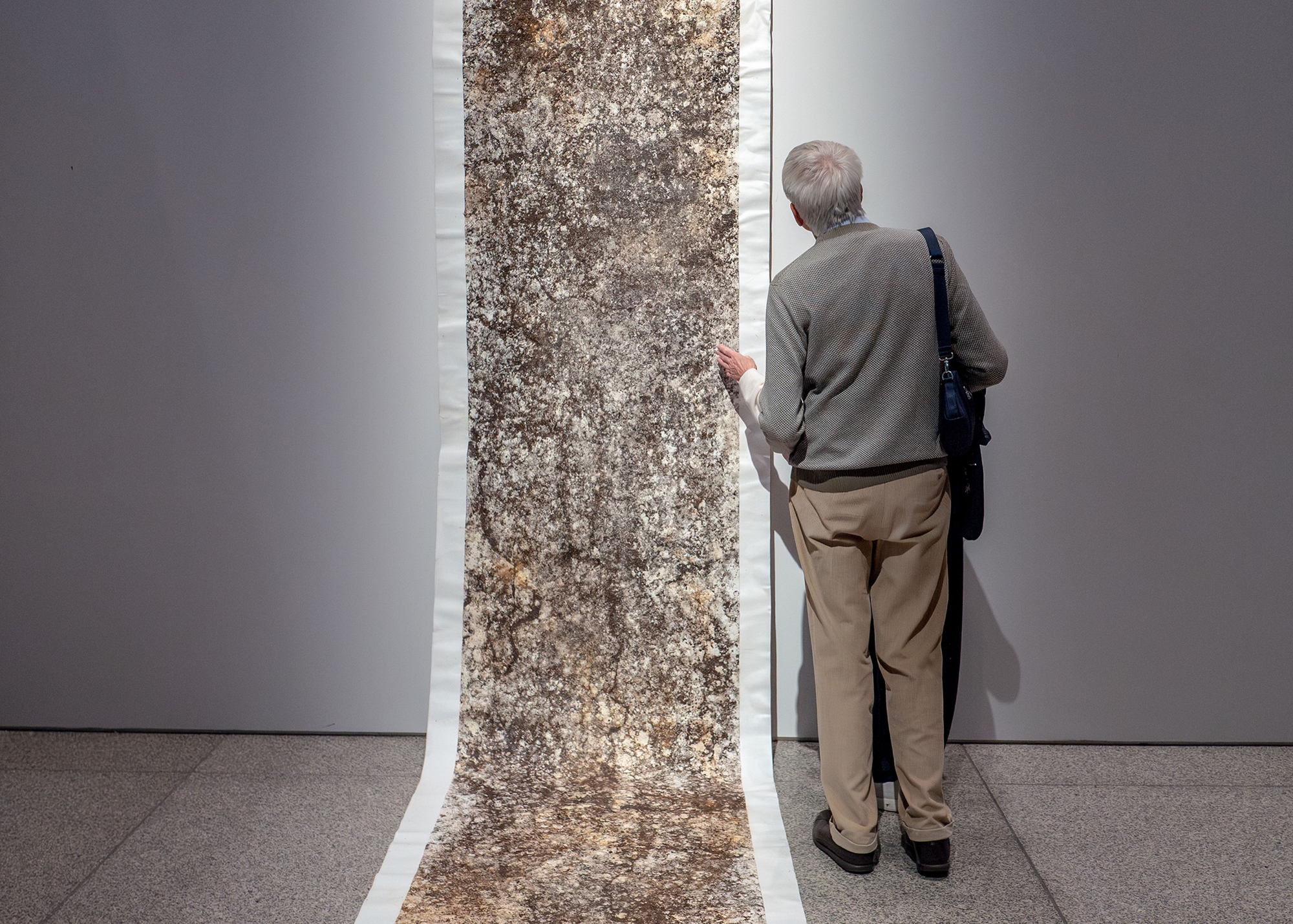 A canvas unrolls down to the floor like a carpet. In Aliou Diack’s Deadline, the artist creates a tangible connection between his work and the earth by using natural pigments that he either produces himself or sources from his surroundings. Unlike acrylic paint, these natural elements act as mediators, transmitting the raw energy of the earth onto the canvas.