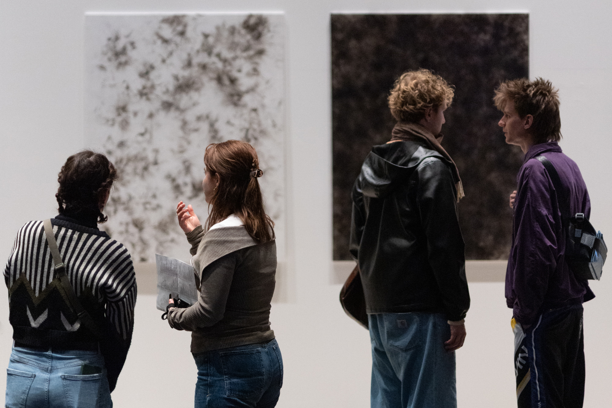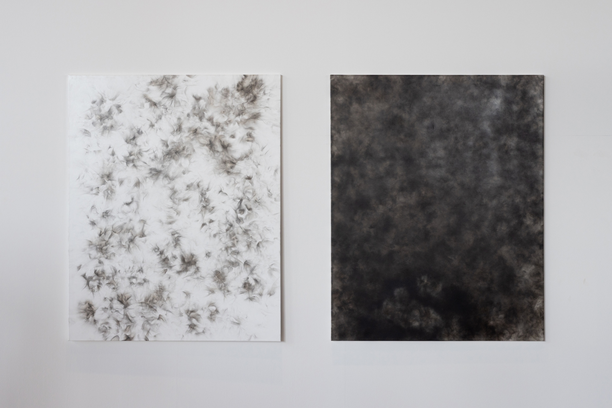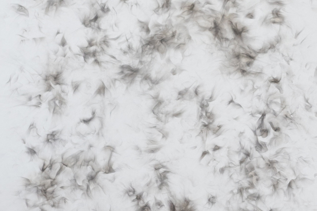 Dan Stockholm has been working on his Firepaintings series since 2022. The colour effects are created by bringing the canvas into such intensive contact with flame that it is entirely covered by soot, yet without setting it on fire. This produces monochrome paintings in varying intensities, giving rise to shapes and depth. The dark structures are reminiscent of explosions or billows of smoke. These pieces were created in response to the war in Ukraine, which the artist has been closely following since the start of the Russian invasion. Though inherently abstract, the pictures nonetheless allow something concrete to shine through – traces of a conflict that manifests itself both visually and emotionally.