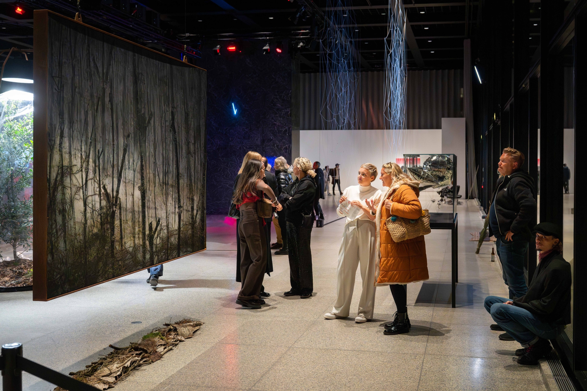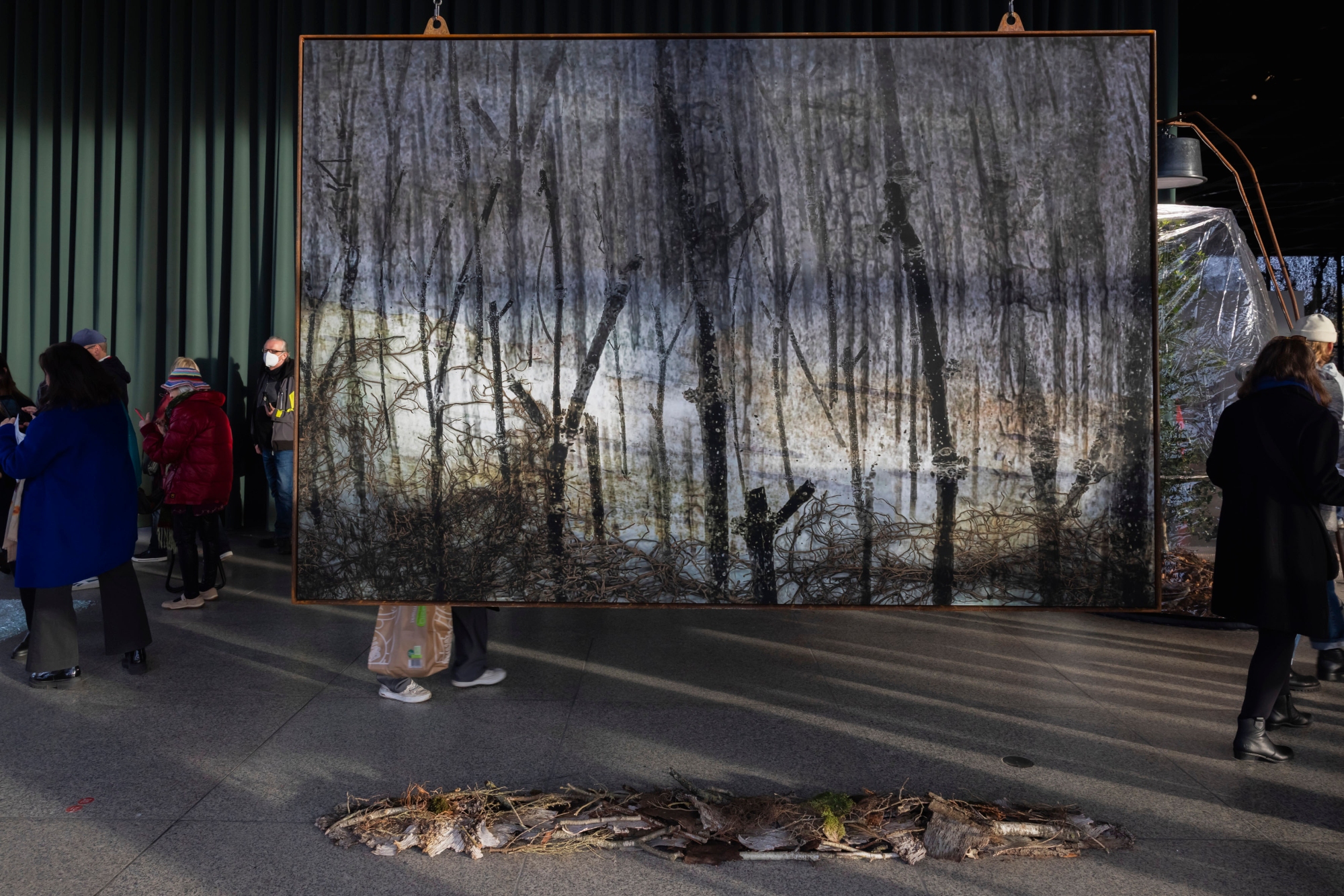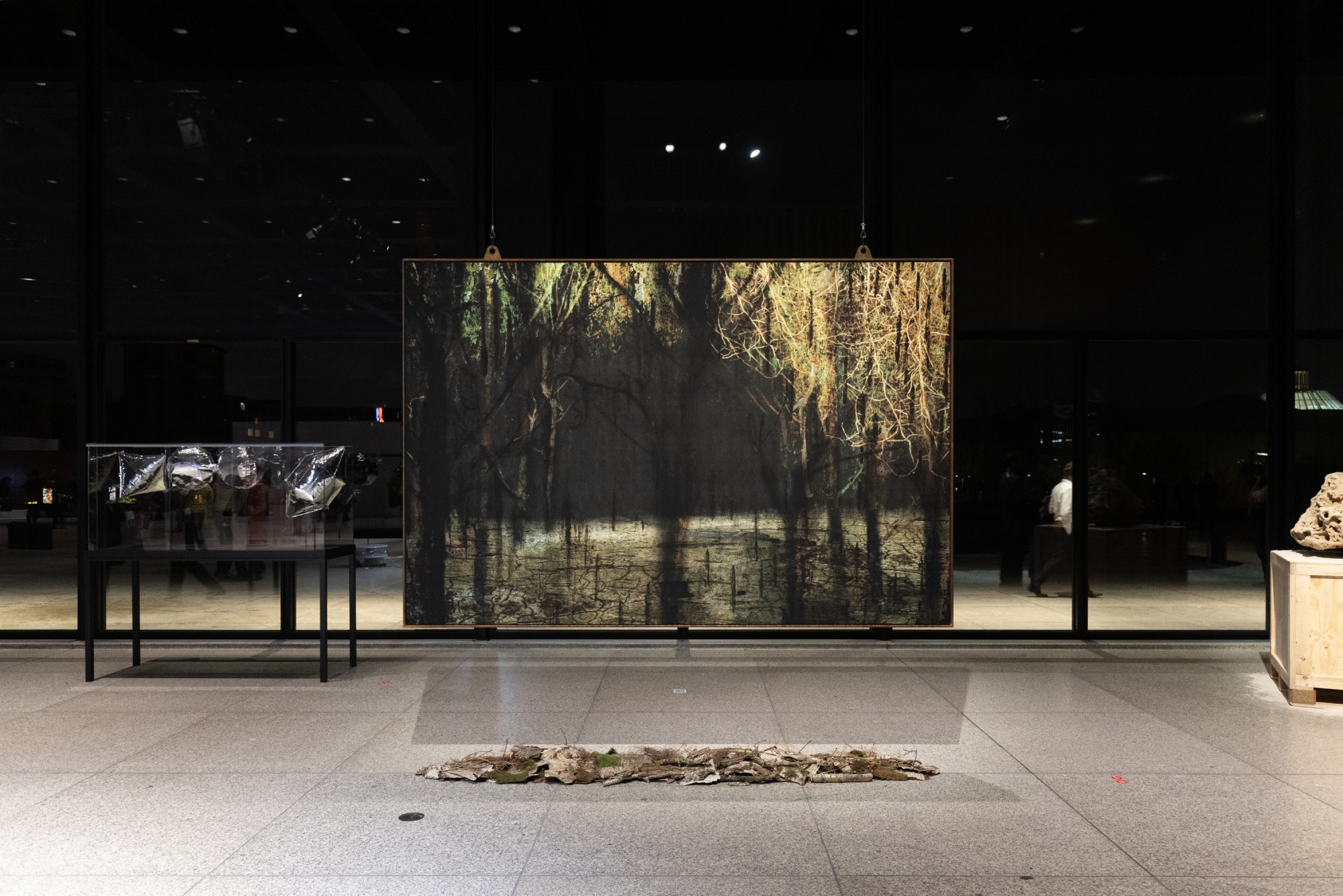 Suspended in space, Dominic-Laurin Kruschwitz’s piece Fragment consists of two atmospheric landscape images. These large-scale compositions are hung back to back, with bark and sticks piled underneath them. Rendered in cold, dark colours, the landscapes tend toward the painterly and the mystical in their aesthetic. The sticks and bark beneath them look real and alive. These were the raw material for the pictures, which the artist assembled from numerous scans of them. Here, nature is not perceived with all our human senses, but rather shaped through digital fragmentation and reappropriation.