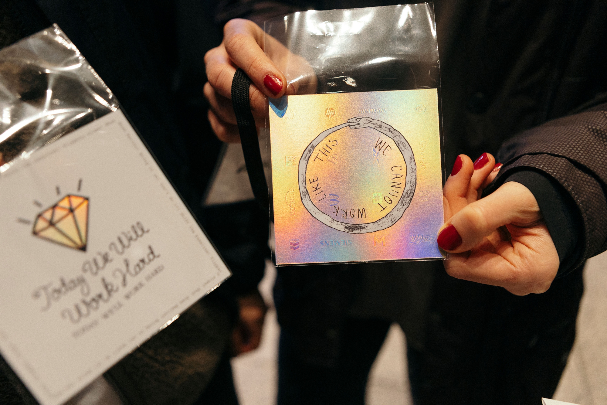 During Elaine W. Ho’s intervention, two individuals distribute small printed cards to visitors. One of them carries a muslin tote bag screen-printed with the message ‘Today we will work hard’, while the other has a bag reading ‘We can’t work like this’. A direct marketing campaign is turned into a critical question about labor and the infrastructures for sociocultural production. This message is a prompt: Should we buy something, or buy into a message? If our work and the things that need to be said waver between motivation and exhaustion, between duty and resistance, what are our frameworks for expression? How is information received? And what do we take home?