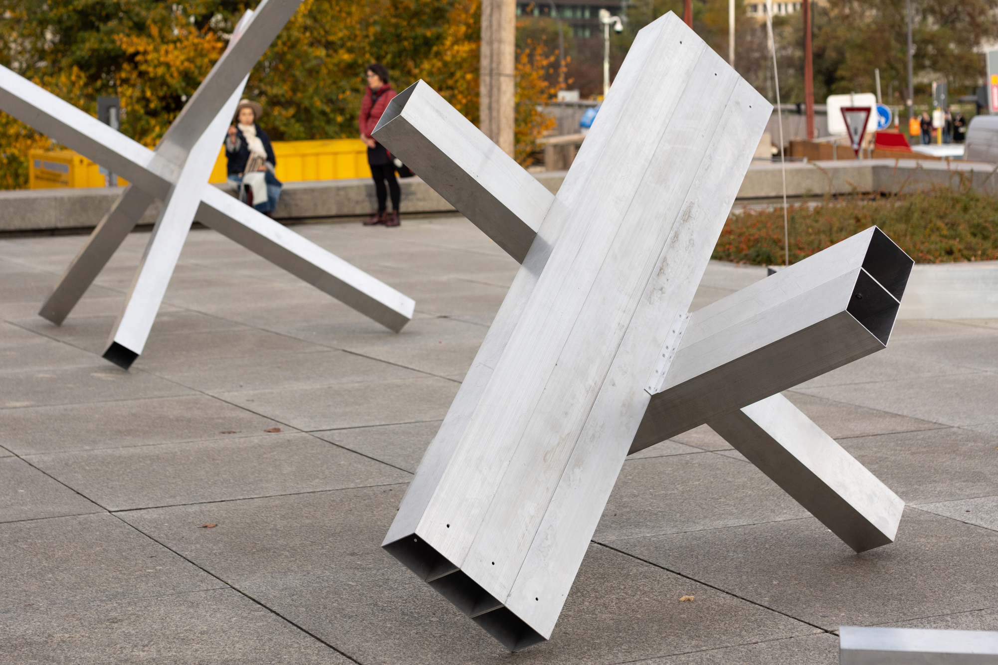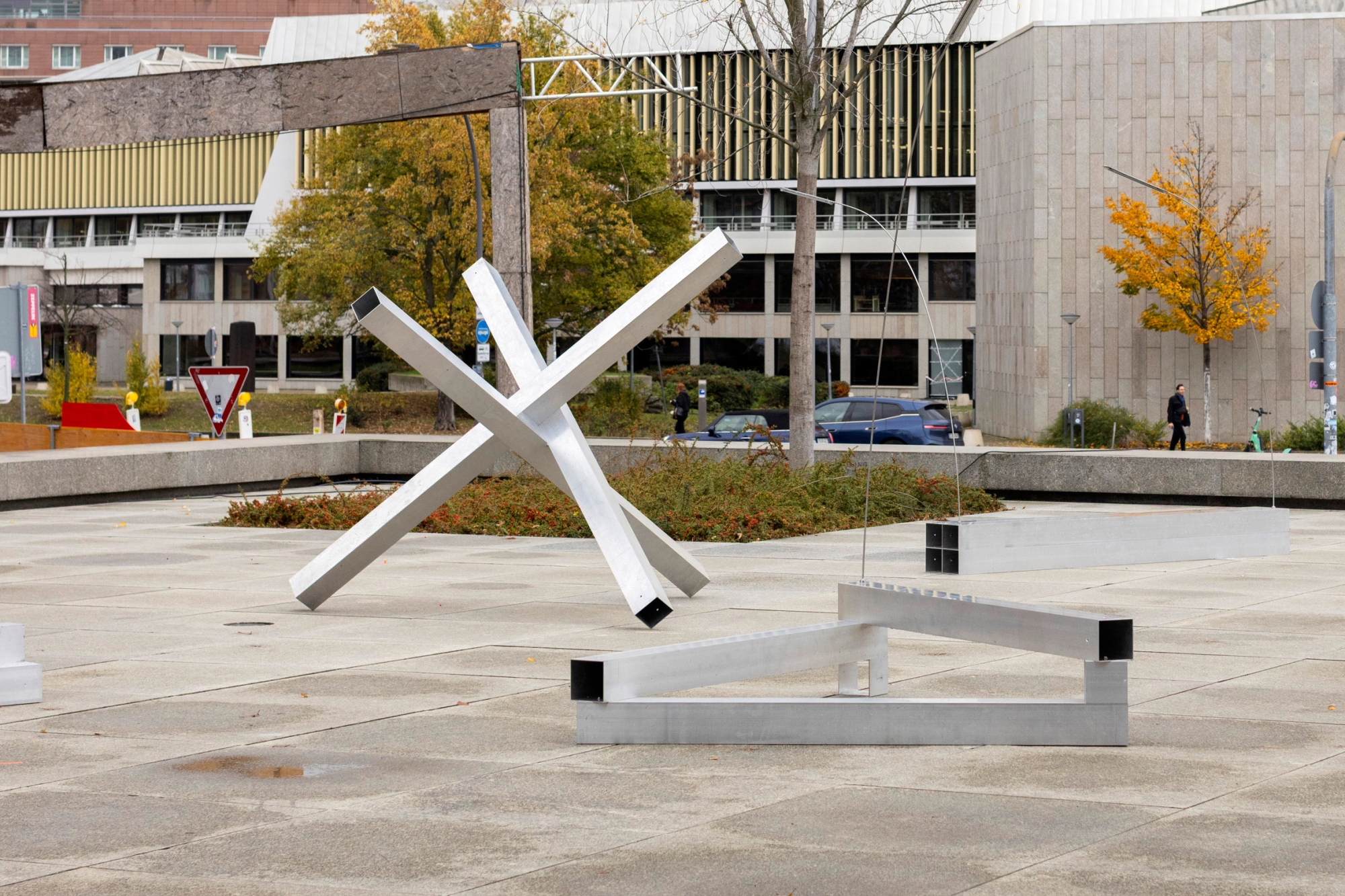 Eine Gruppe modularer Objekte aus 150-mm-Standard-Aluminiumrohren verteilt sich über die Terrasse von Mies Neuer Nationalgalerie. Glänzend und doch roh, zitieren sie eine minimalistische Formensprache und bilden gleichzeitig funktionale (soziale) Plastiken. Hergestellt aus wiederverwendeten Materialien, verwischen sie die Grenze zwischen zweckmäßigen DIY-Möbeln und dem visuellen Vokabular luxuriöser Flagship-Stores.