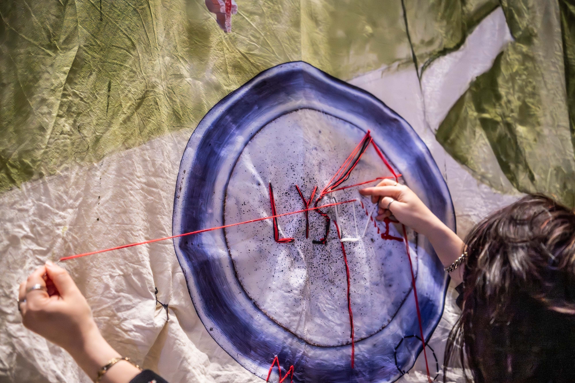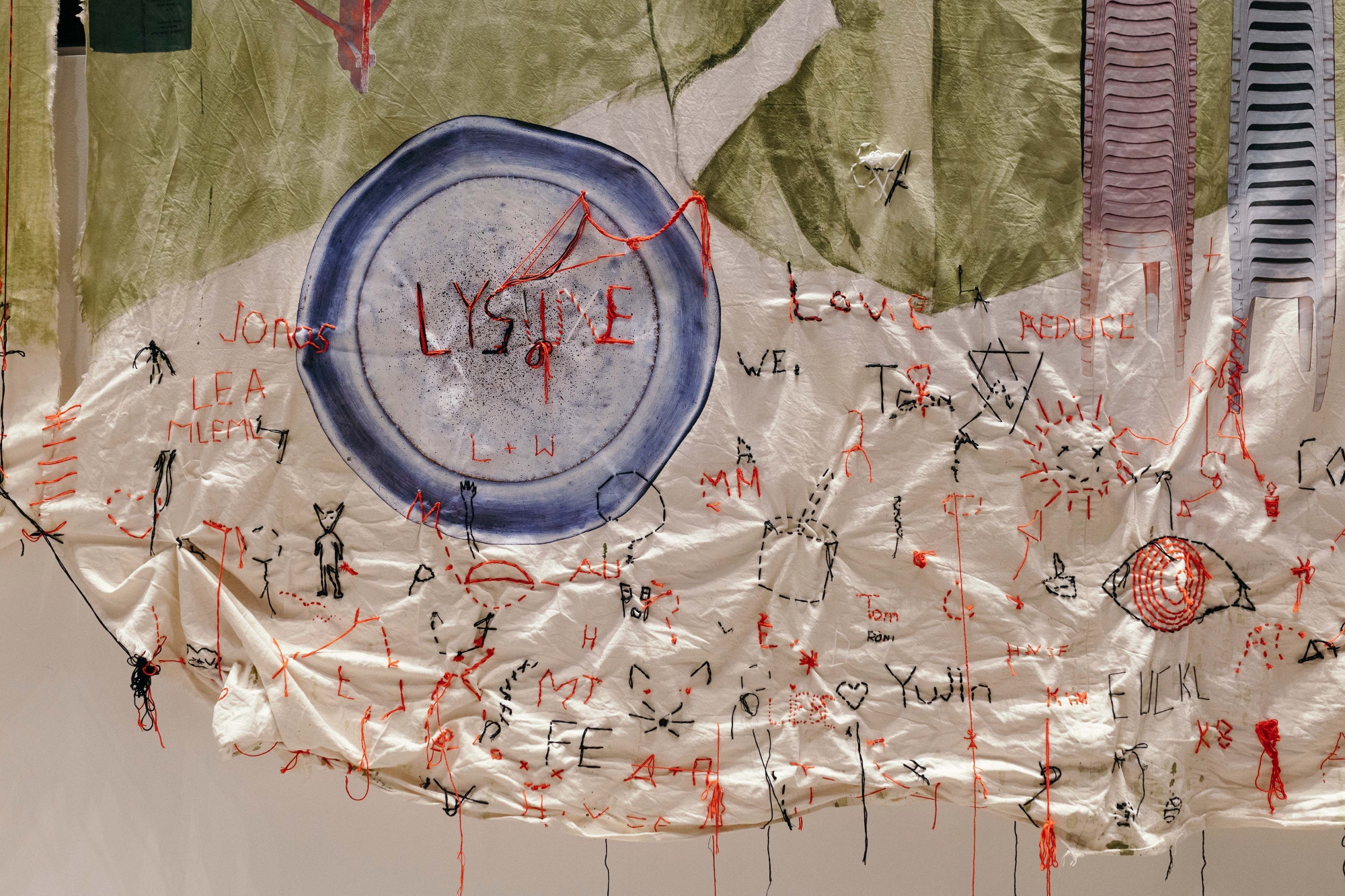 Sewing and stitching forms and texts into the fabrics, the artist invites visitors to share their own experiences of informal support structures and will integrate these onto the fabric. An exchange of thoughts is started: How can the existing informal economies and indigenous support systems be channelled into the operation of formally registered spaces? How can this process be supported and facilitated by the official authorities and systems? And what avenues already exist that might be exploited, adapted, or made to fit?