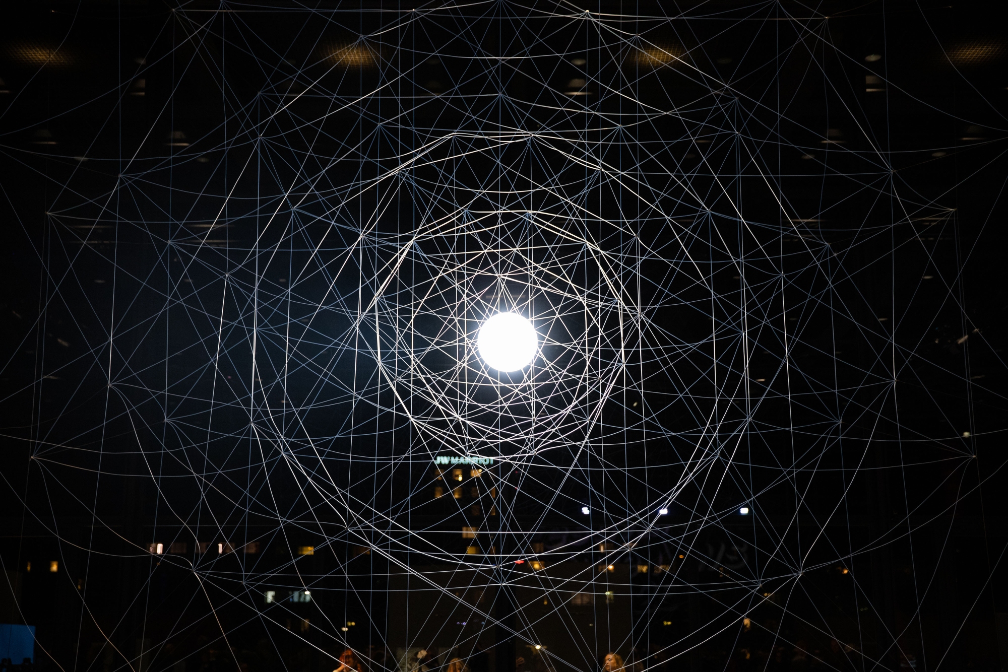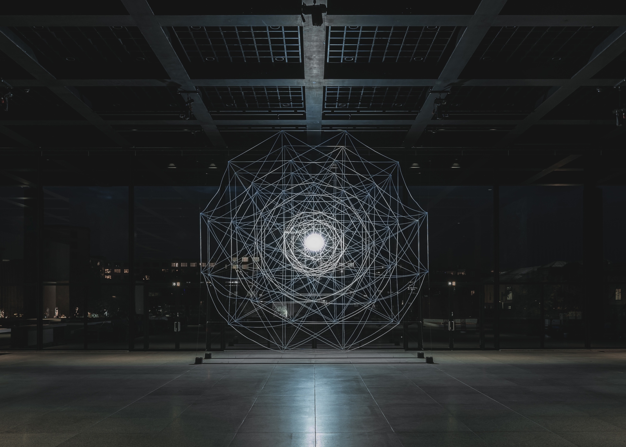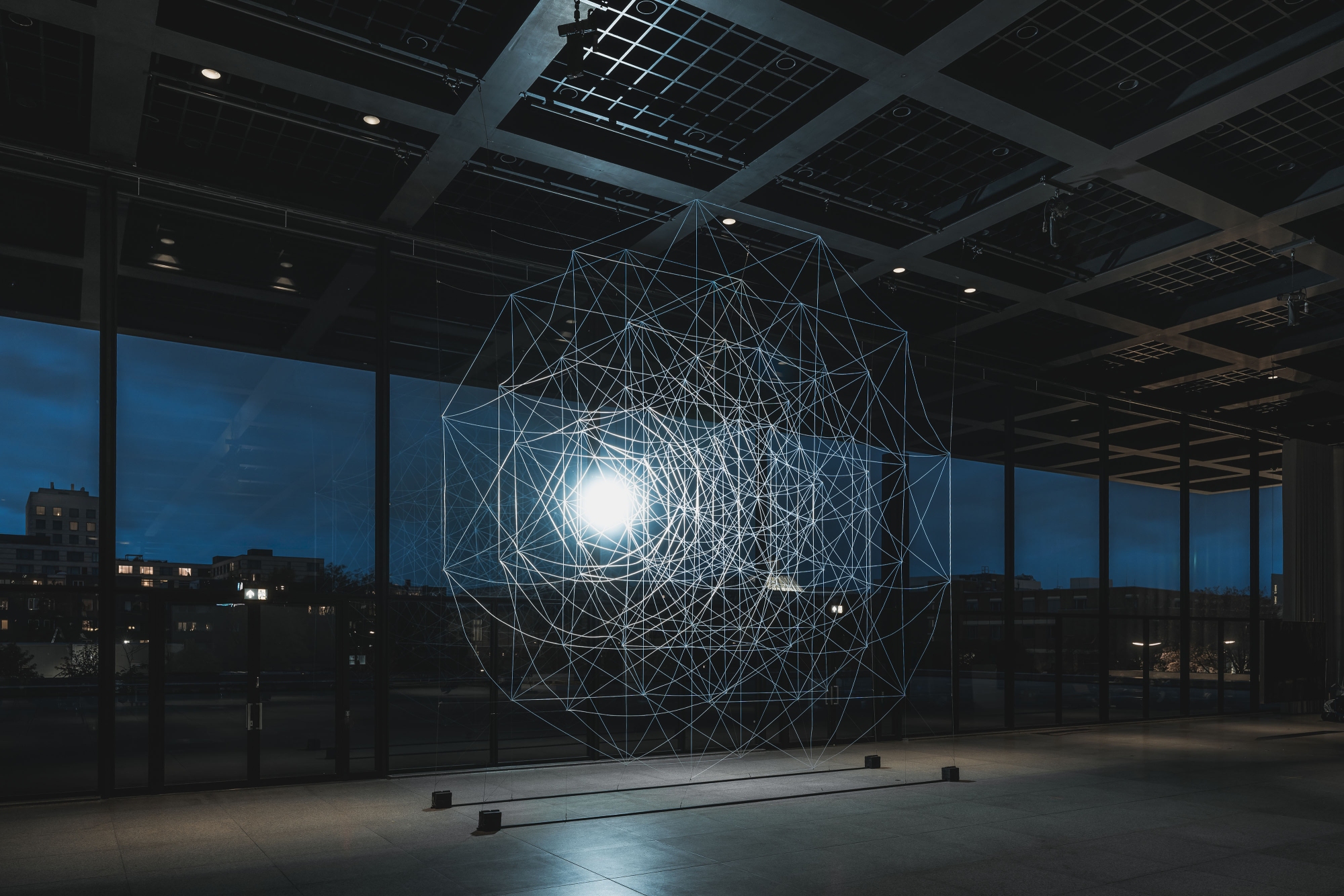 Vom Boden bis zur Decke bilden riesige, zarte Netze durchscheinender, reflektierender Textilfasern schwebende, beinahe architektonische Formen. Basierend auf dem Projektionsdiagramm eines sechsdimensionalen Würfels und beleuchtet von einer einzigen großen Lichtquelle, wirken diese ätherischen Geometrien mit dem Licht zusammen und erzeugen mehrdeutige räumliche Konstellationen. Diese evozieren sowohl das Kosmische als auch das nicht Greifbare und verändern sich mit den Bewegungen der Betrachter*innen. Ivana Frankes Werk schwankt zwischen Sichtbarkeit und Unsichtbarkeit und verweist auf gleichzeitig vorhandene Zustände, die dem Bewusstsein aber oft verborgen bleiben. Es zeigt, dass Wahrnehmung niemals unveränderlich ist, sondern ständig zwischen Erkennen und dem, was nicht vollständig erkannt werden kann, oszilliert.