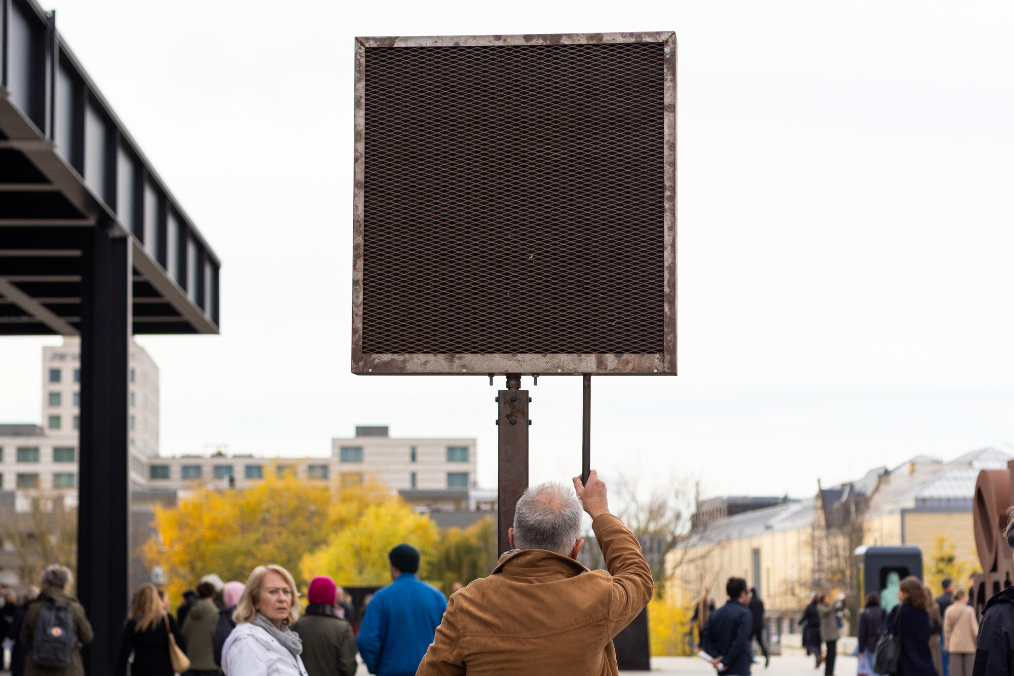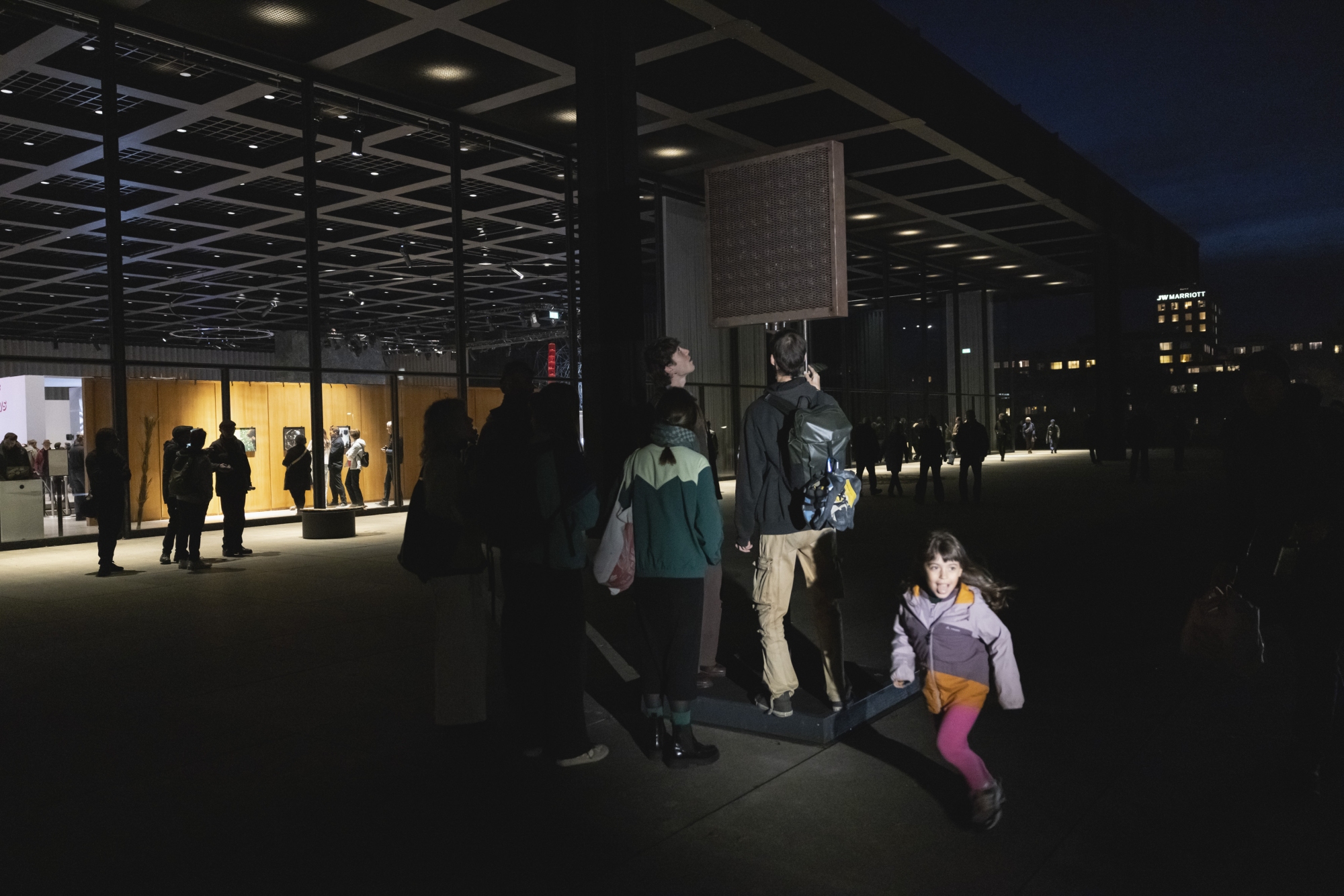 A loudspeaker set-up installed on the terrace of the Neue Nationalgalerie is set rotating. It transmits electronic audio signals that reflect the museum’s architecture. The Neue Nationalgalerie is thus placed in relation to its surroundings sonically; proportions, distances, and materials are recorded not visually, but rather sonically. At the same time, the piece directly addresses visitors’ ears: phantom sounds, different for each listener, arise in the ear canal – an exchange between the physical outdoor space and the internal world of experience.
