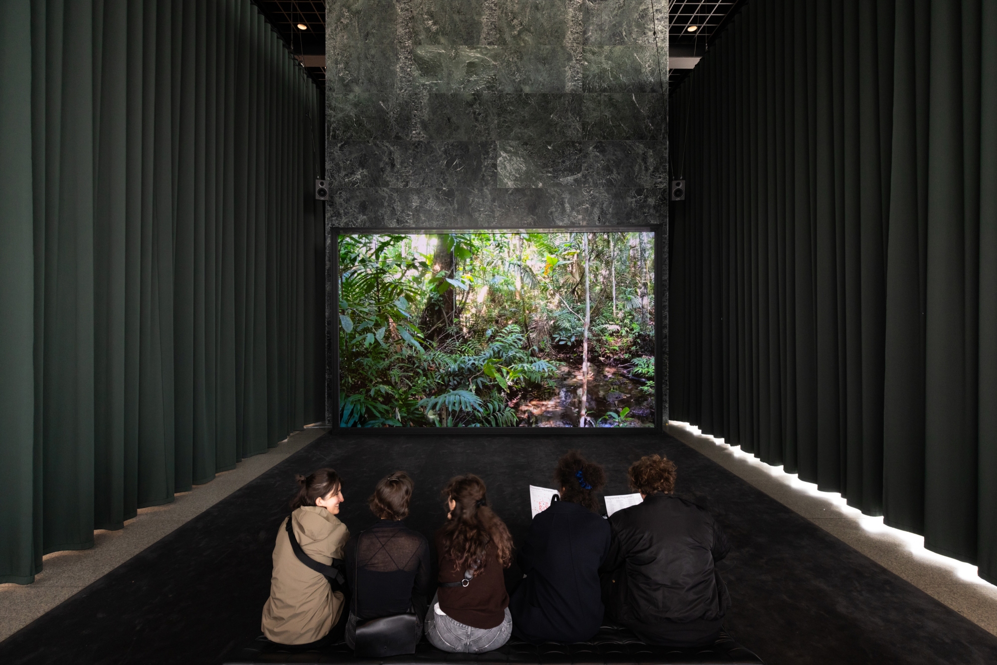 In der Neuen Nationalgalerie öffnet Julian Charrière ein Fenster zum brasilianischen Amazonas. Die Besucher*innen können per Livestream den Regenwald sehen, hören – und über eine Telefonzelle auf der Terrasse mit dem Wald „sprechen“. Spezielle Mikrofone nehmen die Klanglandschaft des Waldes auf, während die Stimmen der Anrufer*innen als Vogelsang-Frequenz in den Wald übertragen werden.