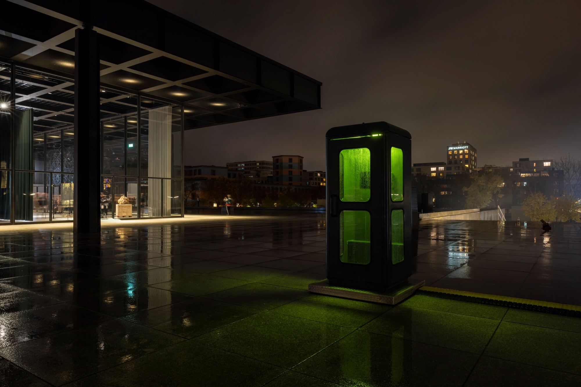 At the Neue Nationalgalerie, Julian Charrière has opened a window onto the Brazilian Amazon. Visitors can see and hear the rainforest via livestream – and from a phone box on the terrace, they can ‘talk’ to it too. Special microphones record the sonic landscape of the forest, and callers’ voices are transmitted back at the frequency of birdsong.