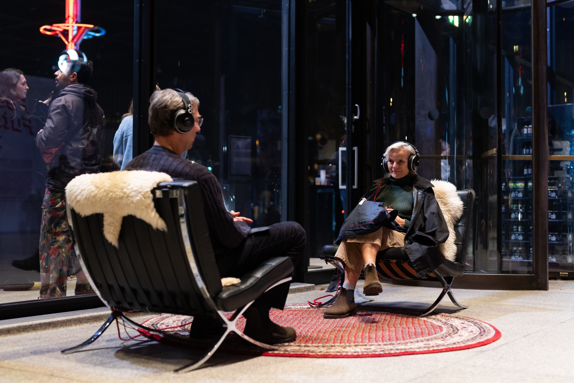 Laura McLardy’s installation I’m Going Out, I’m Going In invites visitors to a moment of conscious human coming together, in which two people gaze into each other’s eyes for three minutes, seeing the other and themselves at the same time. Through headphones, they hear questions, such as: What might have made the person sad? What scares them? What do they need most right now?