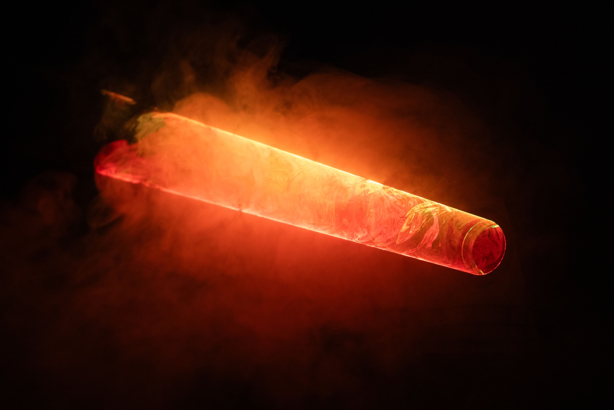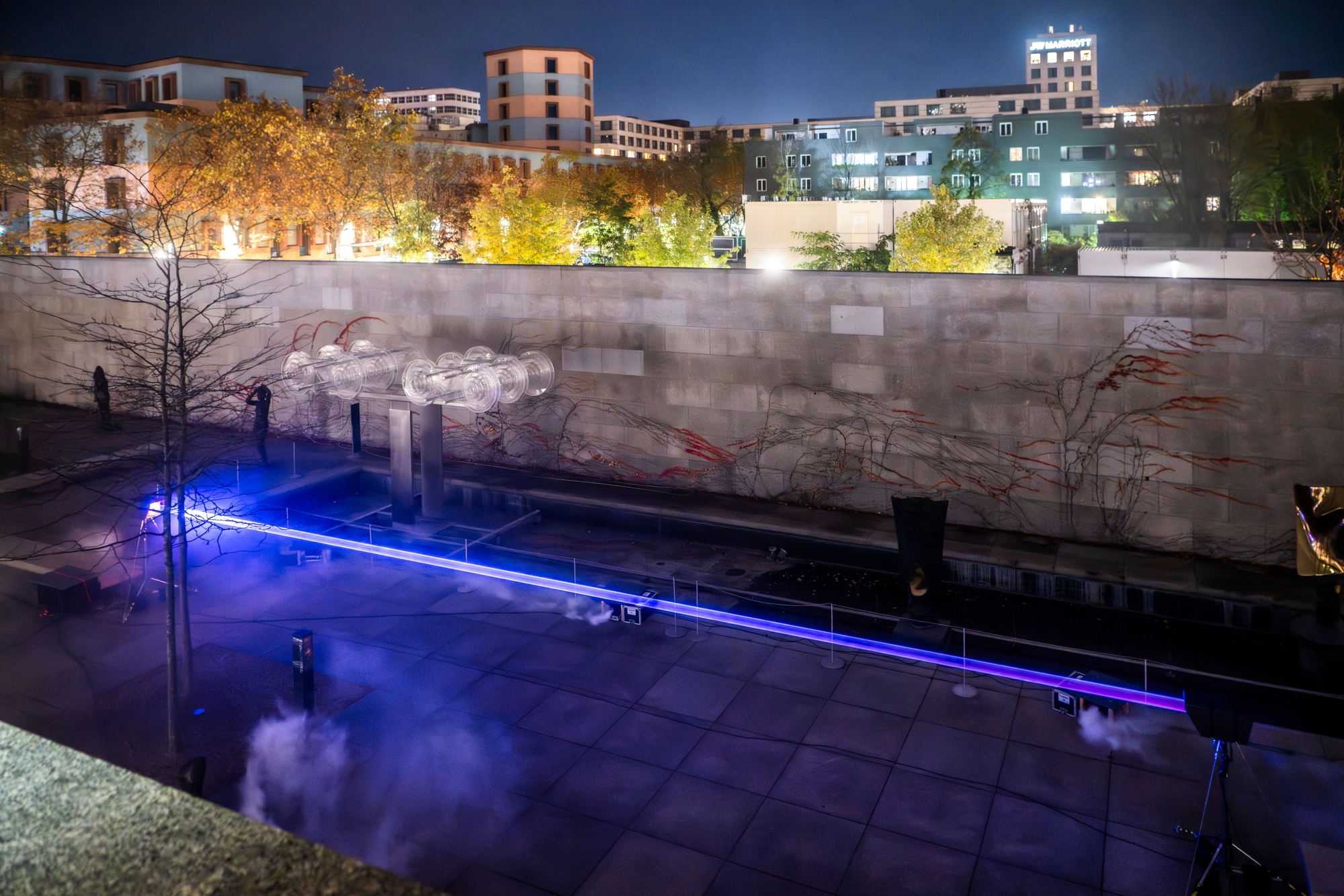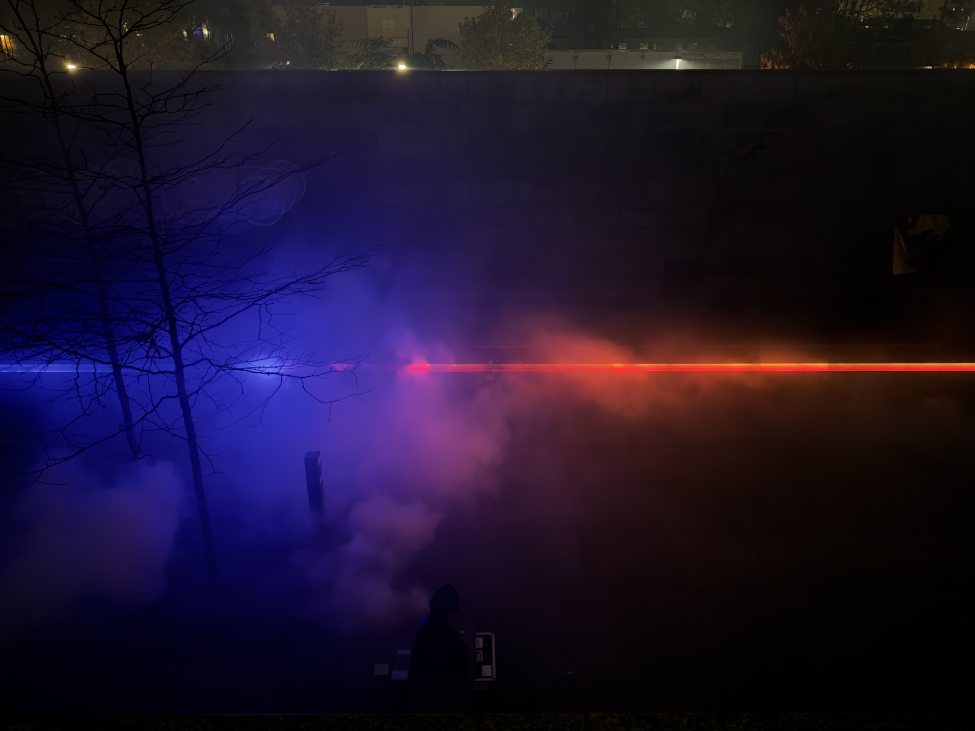 In the Neue Nationalgalerie’s sculpture garden, two machines stand facing one another, emitting laser beams that form a tubular shape of light. One beam is a cold blue, the other a warm red. This is made visible only by particles in the air – ephemeral, yet at the same time clearly perceptible. A delicate play of colours emerges, oscillating between cold and warmth, presence and disappearance. The experience changes depending on where one is standing – sometimes the gradient is predominantly blue, other times red.