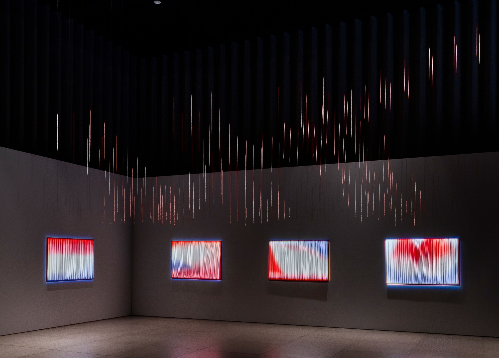 Traditional dyeing techniques inspire subtle colour gradients on pleated silk, evoking the illusion of a shifting landscape. The interplay of light, material, and movement creates a contemplative environment – an invitation to slow down, breathe, and sense the invisible forces shaping our world.