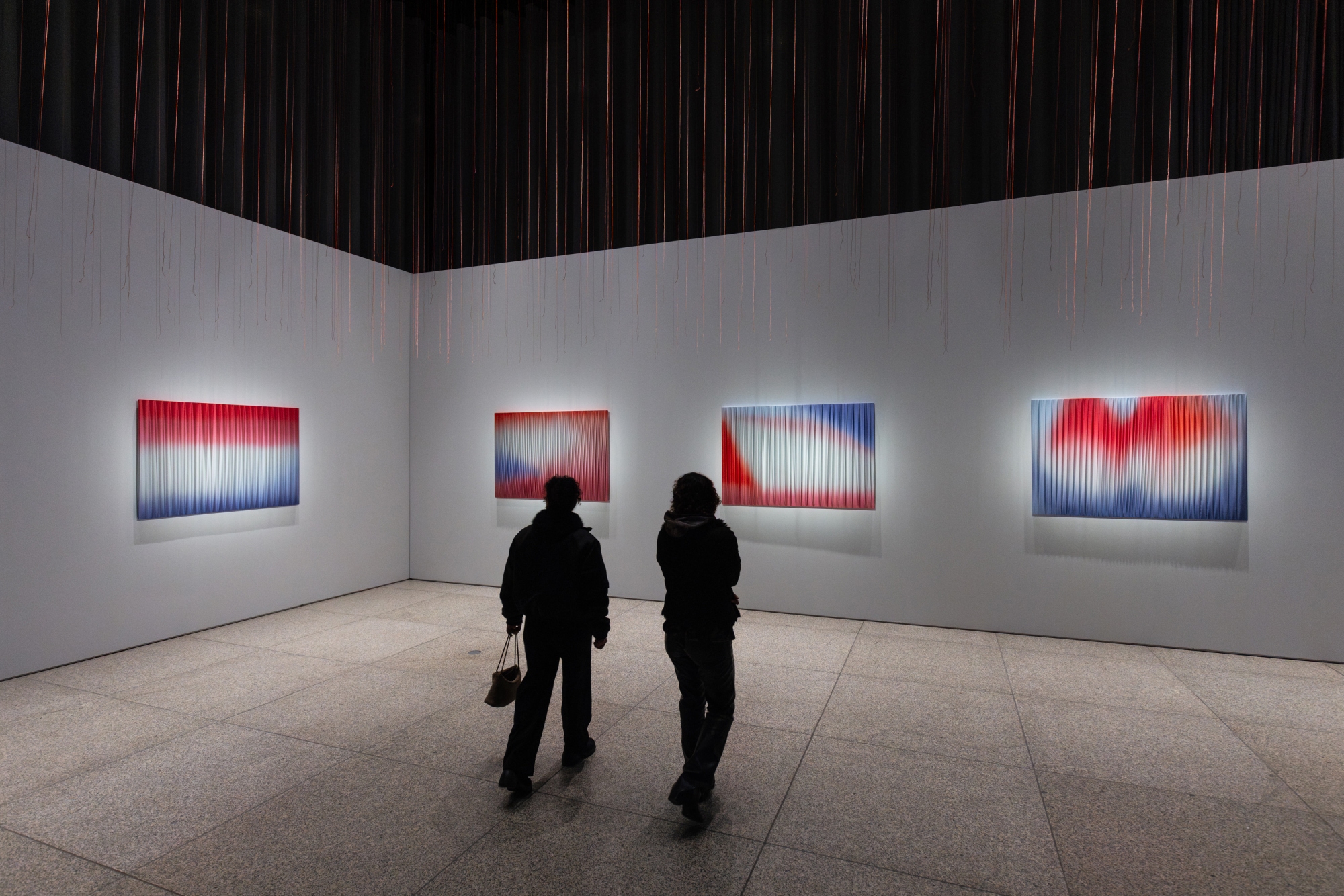 Traditionelle Färbetechniken sorgen auf plissierter Seide für subtile Farbverläufe und erwecken die Illusion einer sich verändernden Landschaft. Das Zusammenspiel von Licht, Material und Bewegung schafft eine kontemplative Umgebung – eine Einladung, langsamer zu werden, zu atmen und die unsichtbaren Kräfte zu spüren, die unsere Welt formen.
