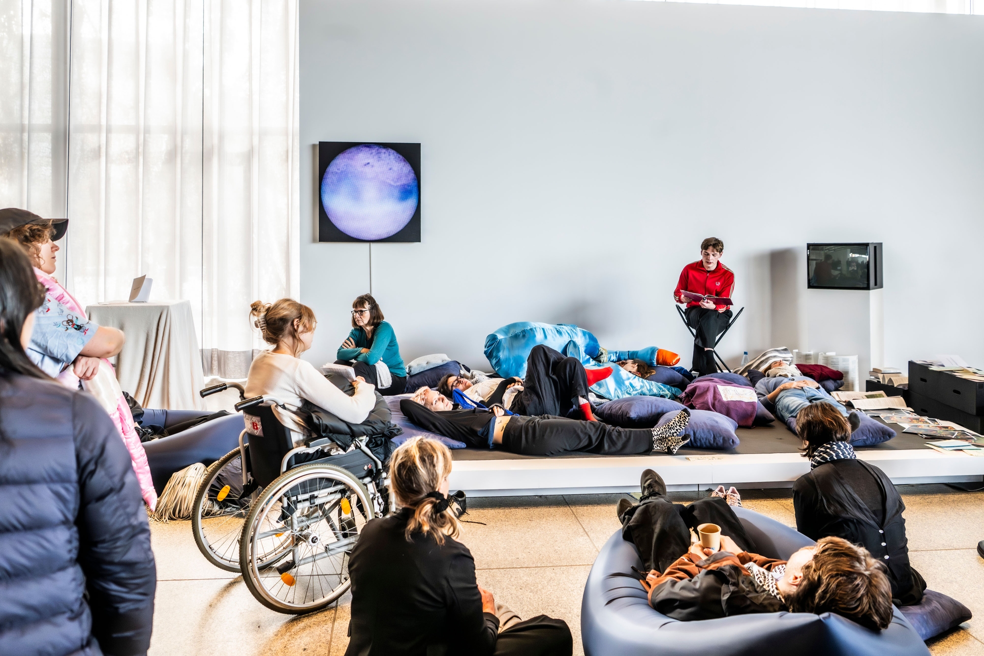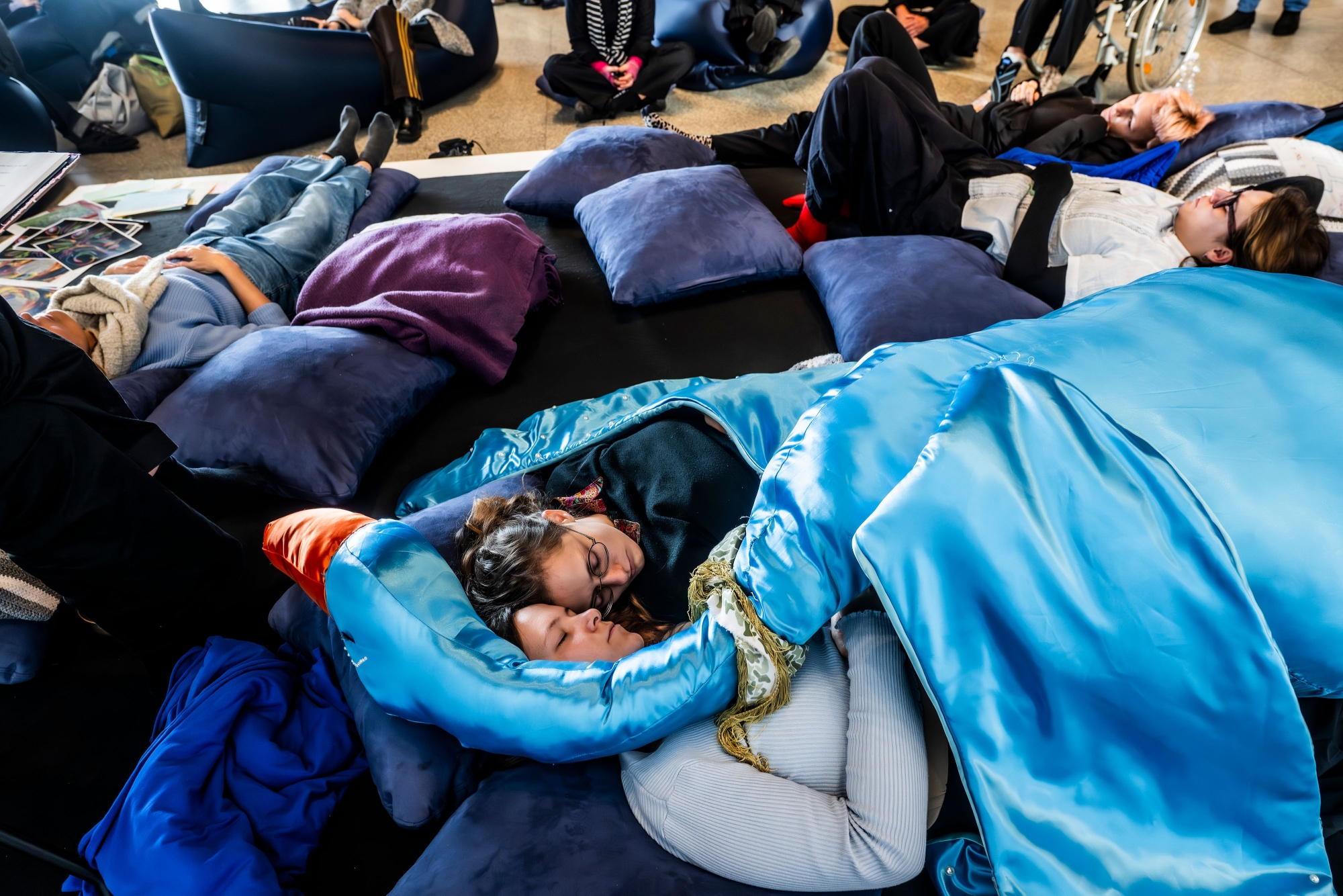The performance piece Breathing (into) the Future, by Roxana Olympia Seehof, Malin Müller, Lena Muley, Melina Julie Sieverling, and Linus Hüsam, invites us to collectively pause for a moment of imagination and hope. In a guided meditation, visitors create visions of a future in which solidarity, community, and care are fundamental values. This piece casts hope as praxis and imagination as resistance in a collective statement against fear, isolation, and resignation: we can shape our future, and we can only do so together.