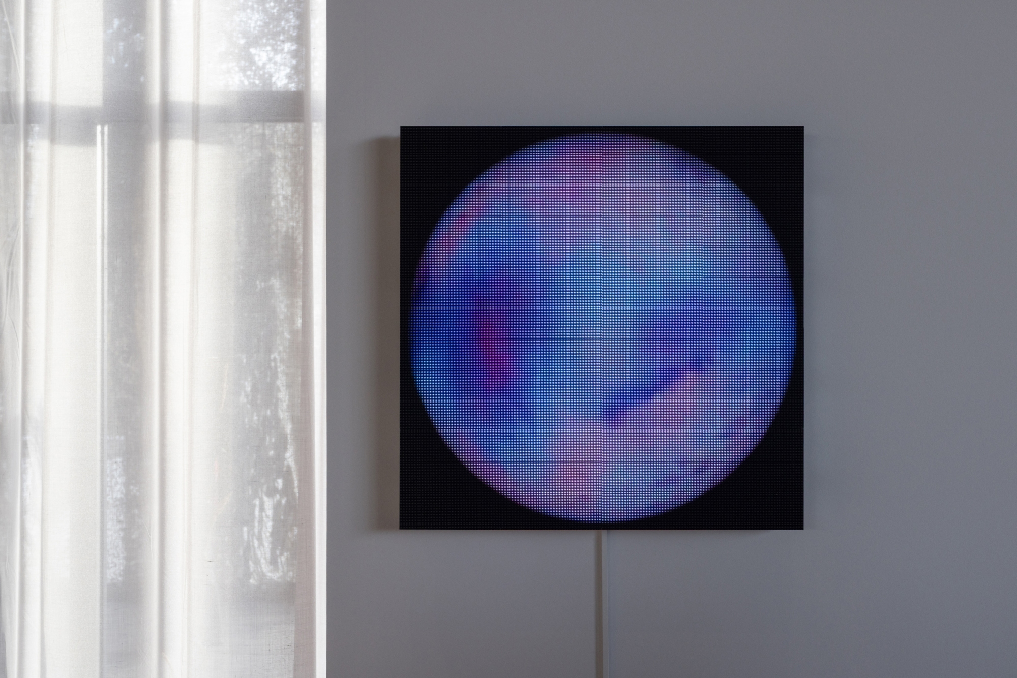 In the Mond (Moon) series, celestial bodies that normally orbit outside our field of vision are made visible. They appear as slowly rotating spheres on glowing LED screens, their movement so languid that it can only be detected after some time. The digital surface is transformed into a place of silence where speed, perception and patience are renegotiated.