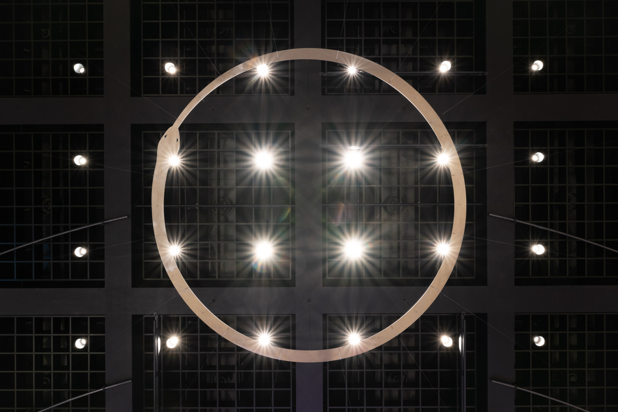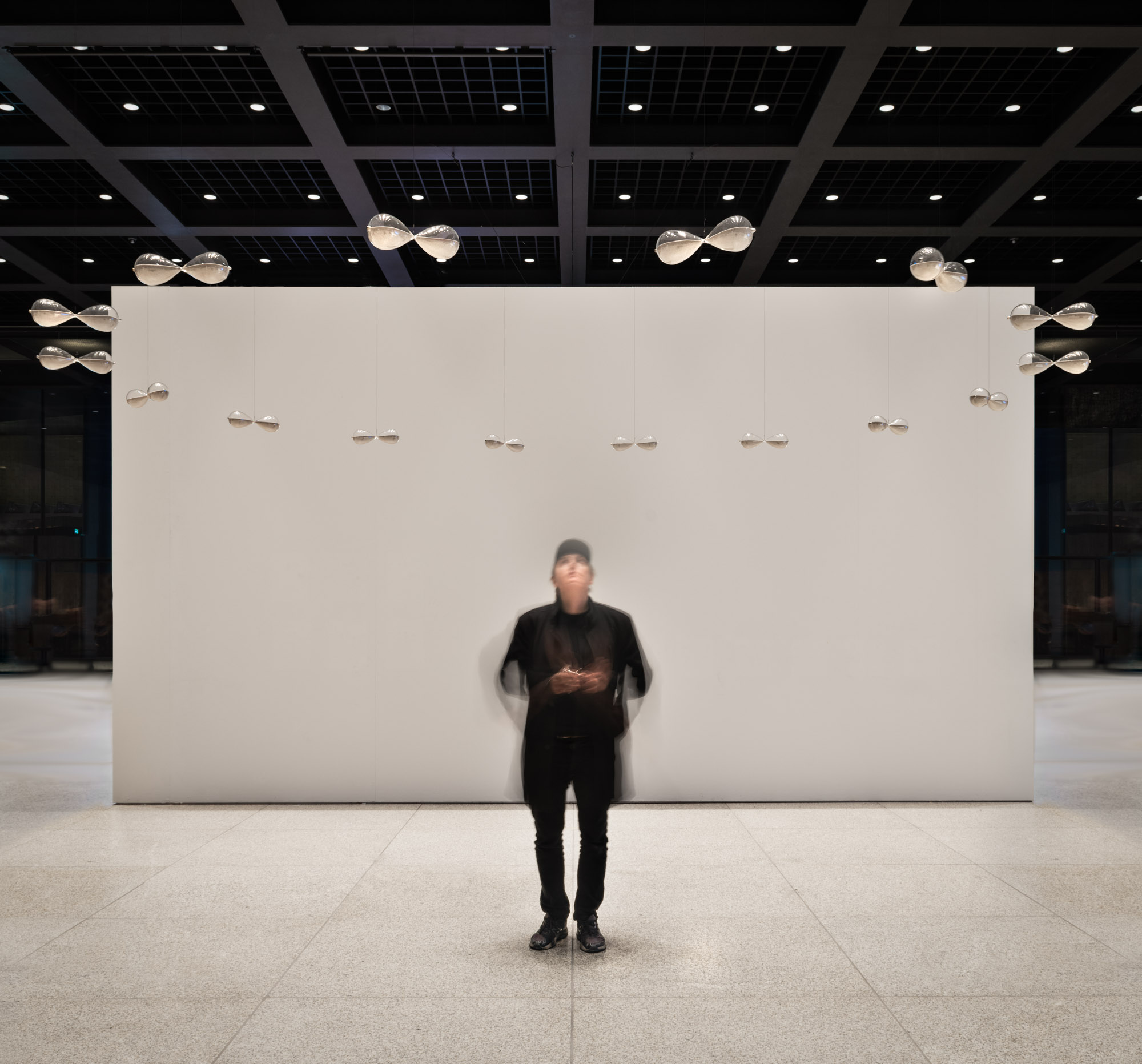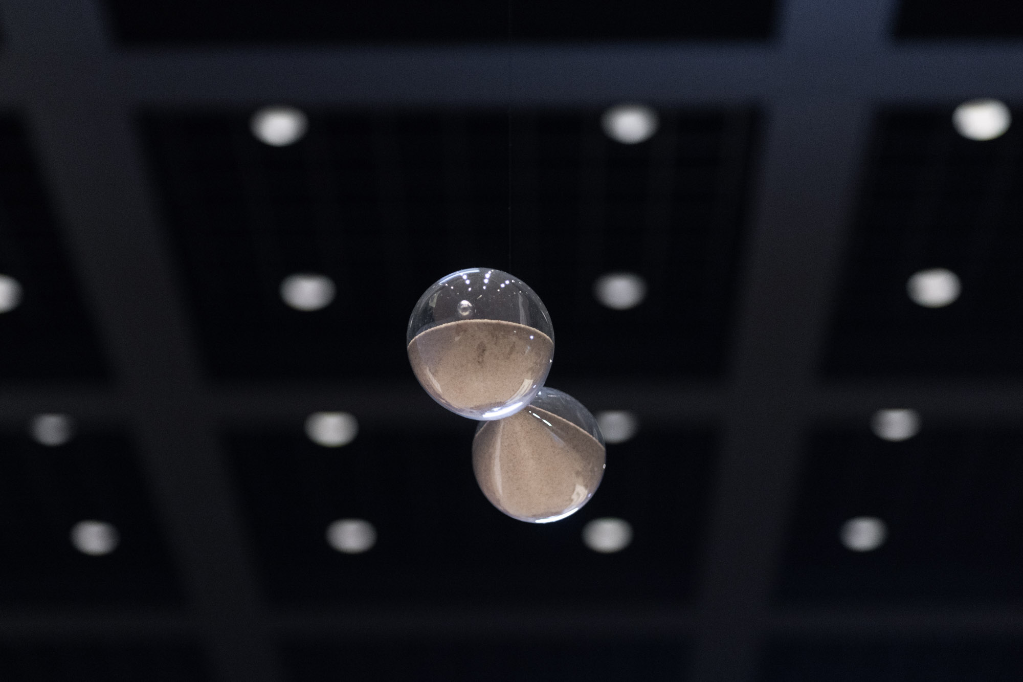 Zirkon Ouroboros consists of sixteen hourglasses filled with zircon, arranged in a circle according to the directions of a 16-point compass rose and suspended from the ceiling of the Neue Nationalgalerie Berlin by an aluminum Ouroboros. In their horizontal position, they have lost their original function, but the zircon sand still refers to the transience of time. The oldest known mineral on earth allows us to look back 4.4 billion years. Almost every rock contains traces of zircon. The radioactive elements uranium and thorium it contains decay into lead over billions of years—a process that, like an internal clock, reveals the age of the mineral and our conception of the age of the Earth. Markus Hoffmann transforms the hourglass from a symbol of vanitas into an abstract conception of time, thus referring to the preciousness and transience of human time as well as the limits of scientific knowledge.