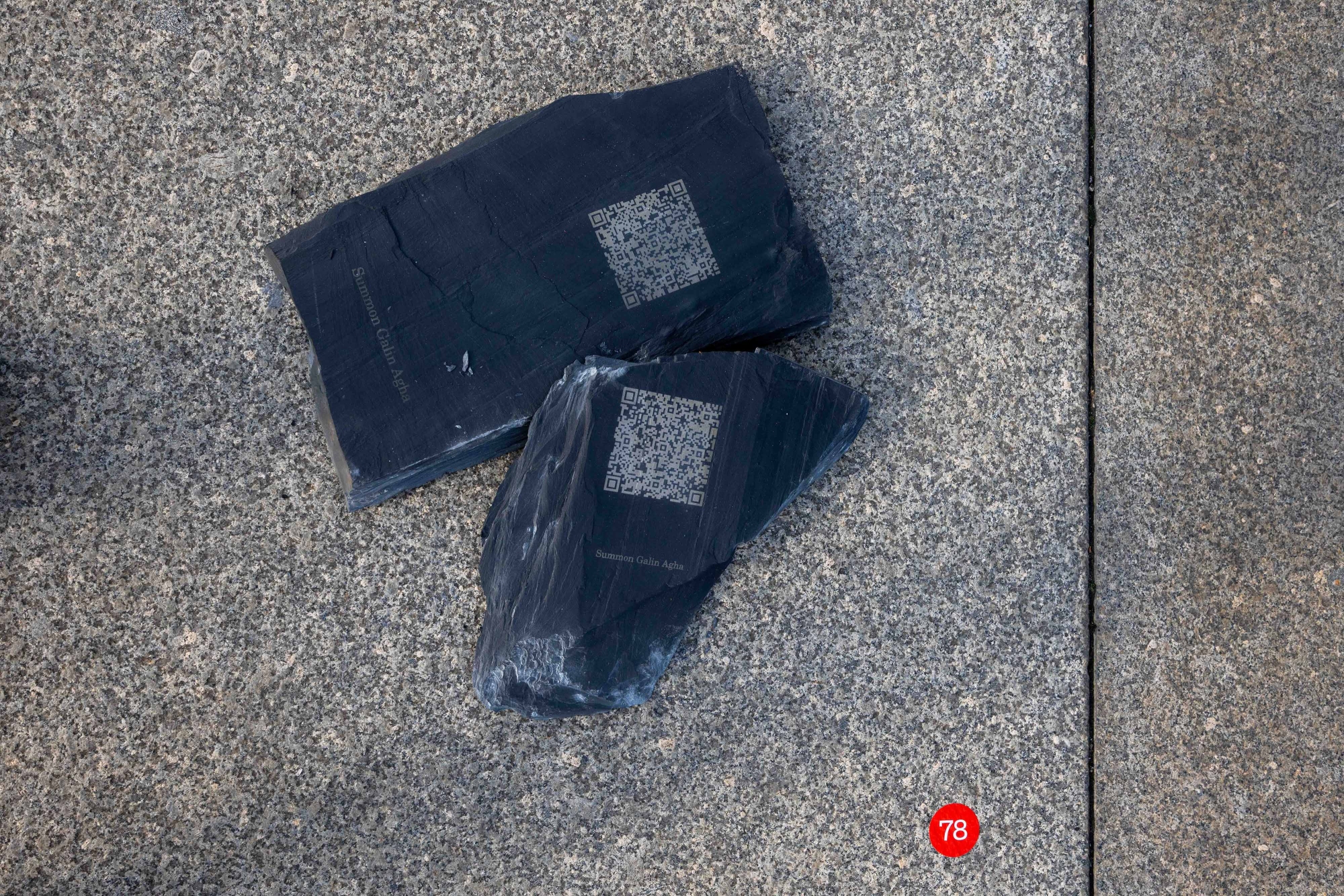 In this project, the digital body of Galin appears in augmented reality around the Neue Nationalgalerie but never enters it – thereby disrupting Western narratives and their boundaries. Visitors summon Galin by scanning a QR code engraved onto a natural stone.