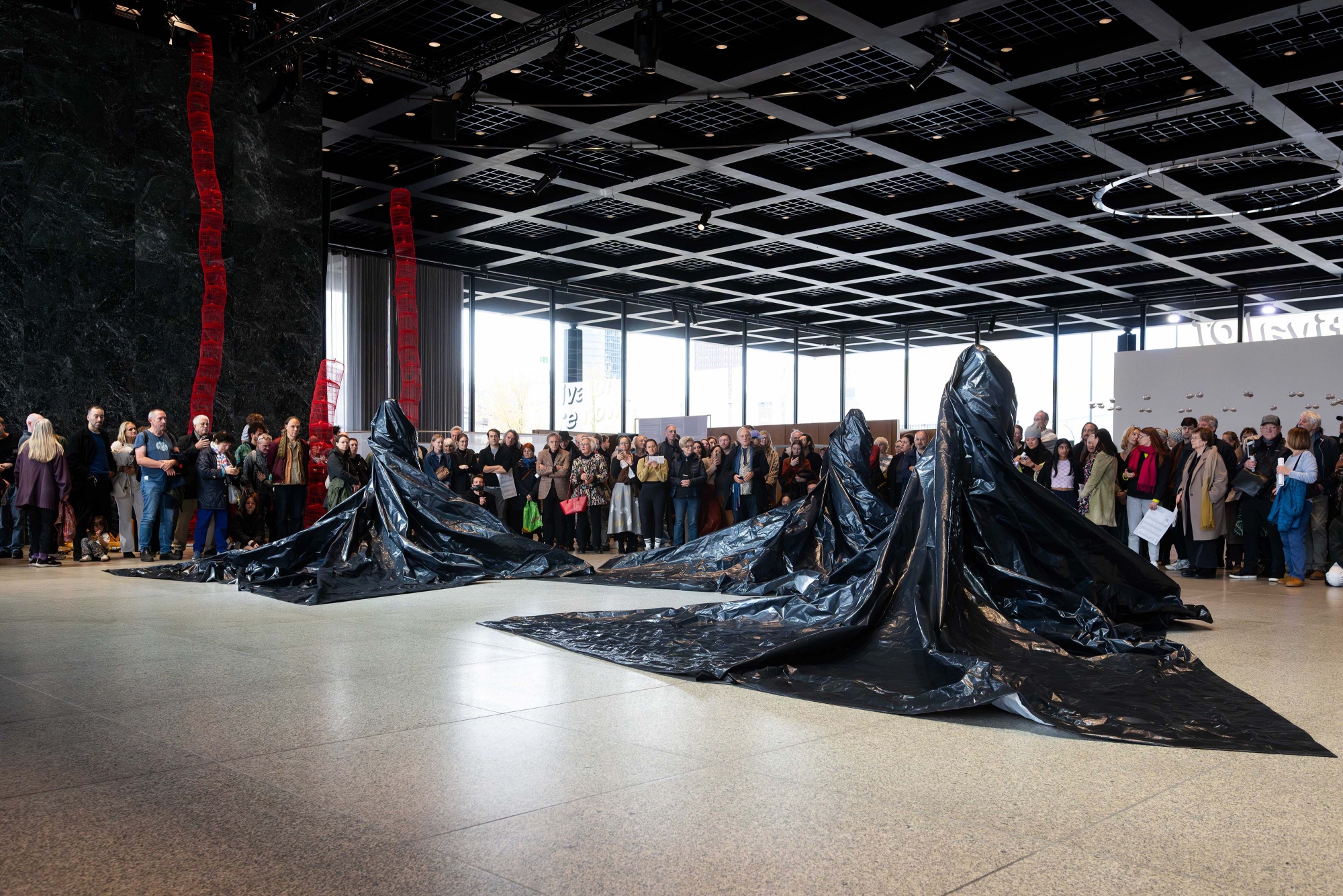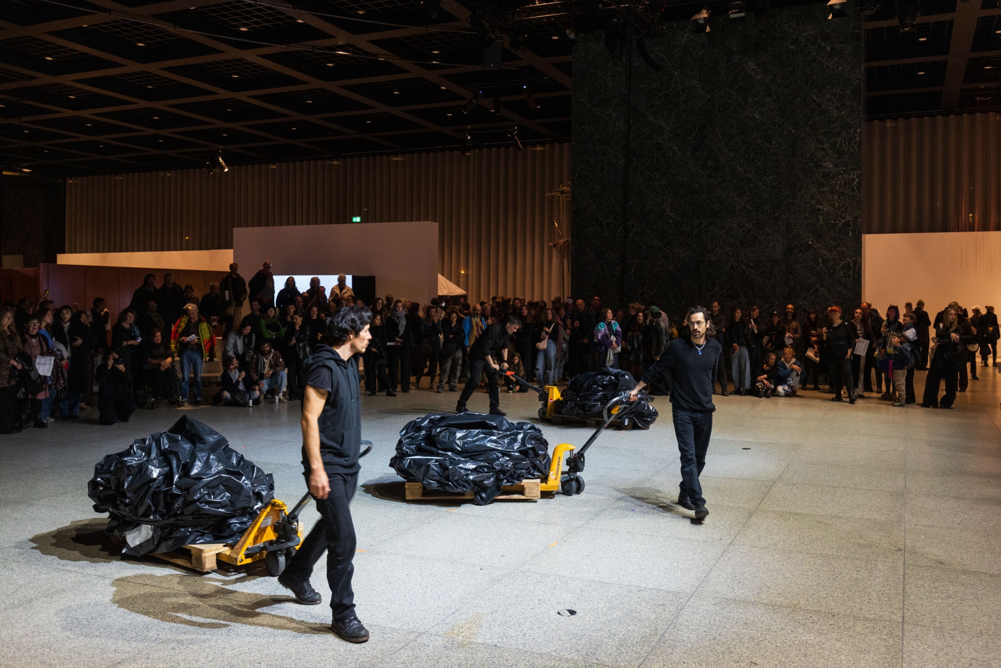 Dancers in foetal positions are carried into the exhibition space and covered with black plastic sheeting. Gradually, the dancers’ bodies rise beneath the sheeting, forming distinct, hidden figures. After exploring various movements and the changing shapes of their bodies, the dancers return to their original positions and are carried away again without ever directly revealing themselves to the audience.
