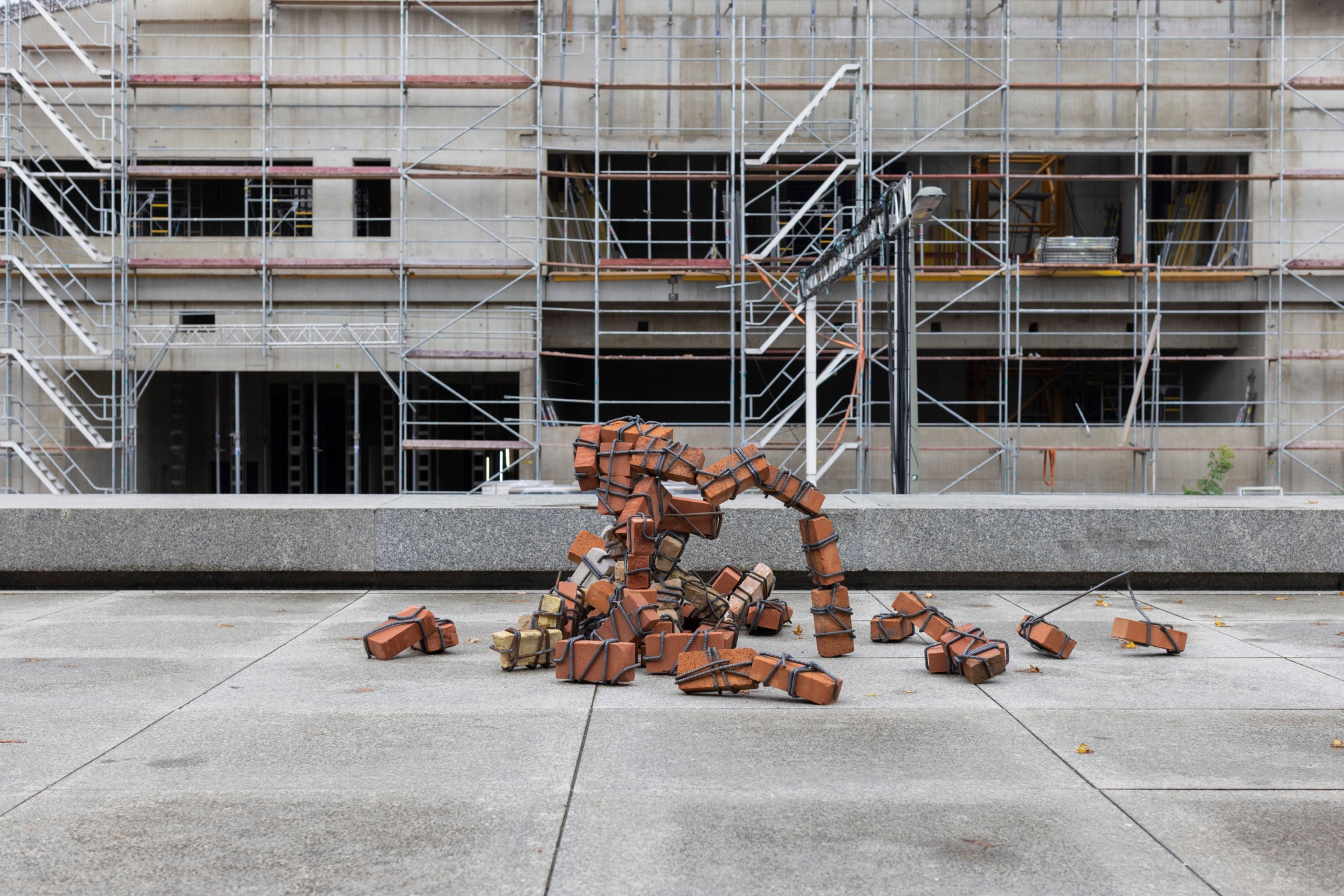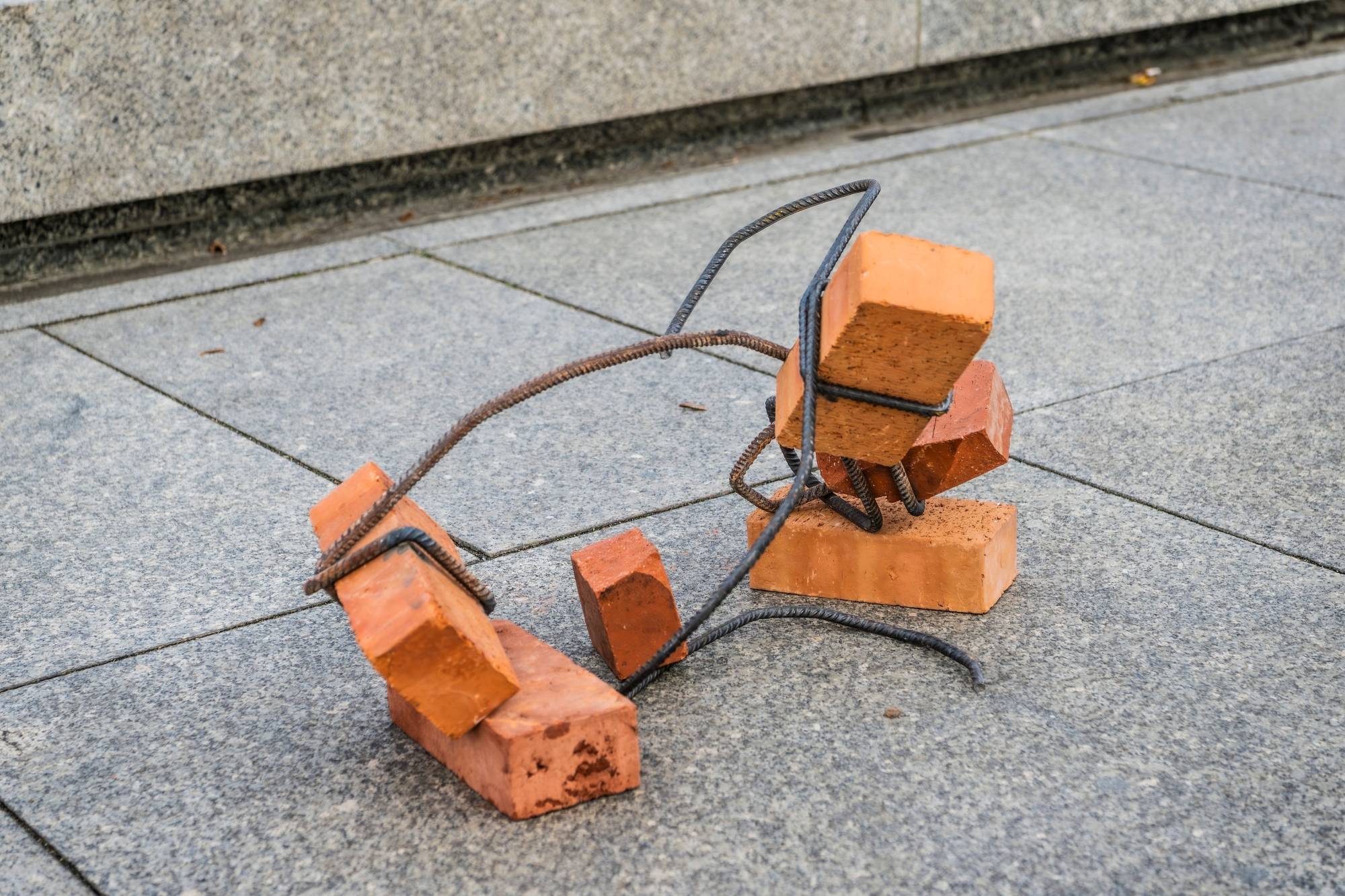 The sculpture ZStV is made of bricks wrapped in steel. Rike Horb’s experimental setup combines steel rebar and standard bricks into a fictional building material, playing with the idea of hybrid construction techniques. The title – short for ‘Ziegelstahlverbund’ (brick-steel composite) – fits right in with German names for common methods of composite construction. The piece inspires us to think about functionality, the heritage of our built environment, and the urgent need for sustainable construction methods.