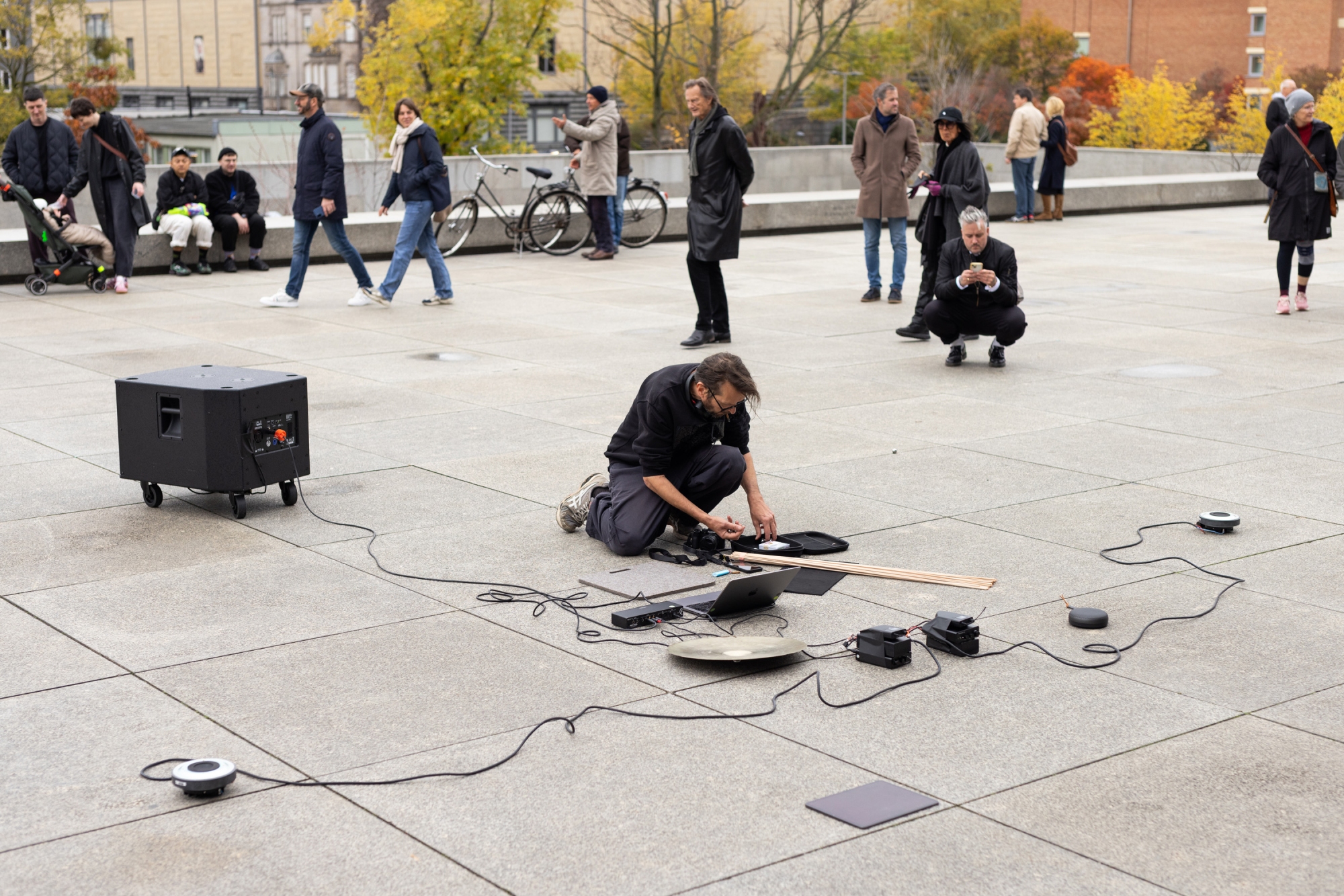 Lippoks performative Sound-Installation Material ist nicht auf geschlossene Räume angewiesen, sondern lässt sich auch im Freien erleben, wie hier. Auf der Terrasse der Neuen Nationalgalerie verweist die Arbeit auf einen Raum, in dem Ungewissheit möglich ist – in dem sich Strukturen auflösen und neu zusammenfinden. Das entstehende Sound-Feld schafft Raum für Friktion und Verletzlichkeit. Eine bestimmte Form, Partitur oder ein Motiv aufzulösen bedeutet, einen Prozess zu öffnen – die Besucher*innen sind eingeladen, sich zu beteiligen und diesen Prozess neu zu entdecken.