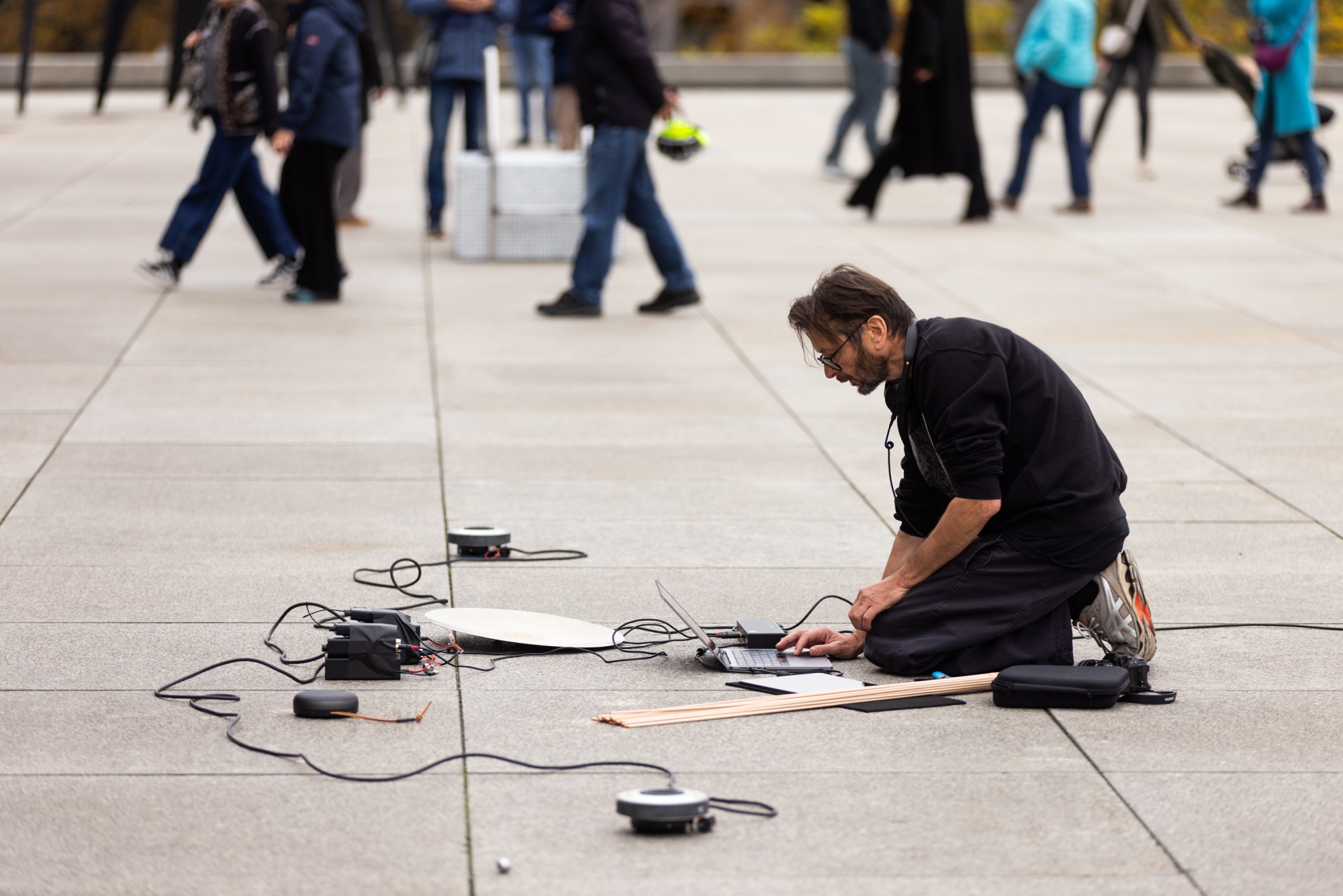 Lippok’s performative sound installation Material doesn’t need to be installed in a closed space, but can be experienced outdoors, as here. On the terrace of the Neue Nationalgalerie, the work addresses a space where uncertainty is possible – where structures dissolve and reassemble. The sonic environment that emerges allows for friction and vulnerability. To undo a form, a score, or a motif means to open up a process – inviting visitors to join in, in discovering it anew.