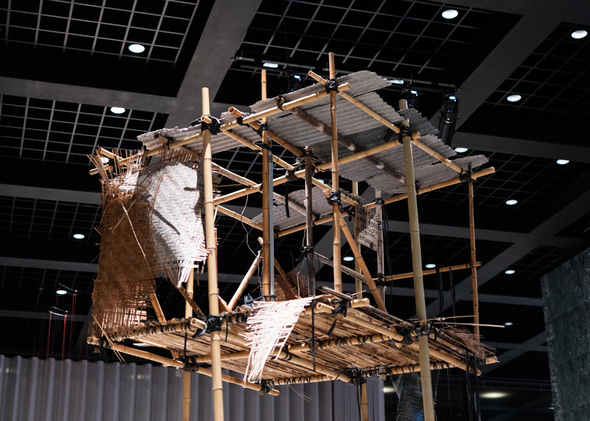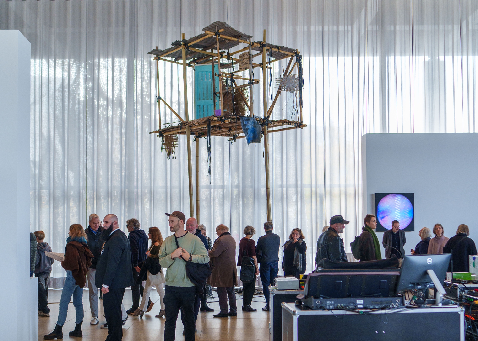 Rudyard Schmidt has built a house on bamboo stilts in the Neue Nationalgalerie’s exhibition hall. This temporary construction technique stands in direct dialogue with the museum’s steel roof structure, which, in 1967, was raised by hydraulic presses and then lowered onto eight columns. In Flipping Fishes Tumbling Cause They Shiver, this structure is juxtaposed with the traditional bamboo architecture of the Philippines, and we are invited to think about the changing realities of life, adaptation to climate conditions, and our awareness of rising sea levels. The piece is an homage to the artist’s family in the archipelago, Philippine art, the necessity of improvisation in the use of materials and resources, the practice of shaping temporary spaces for social life, and the everyday collective use of such spaces.