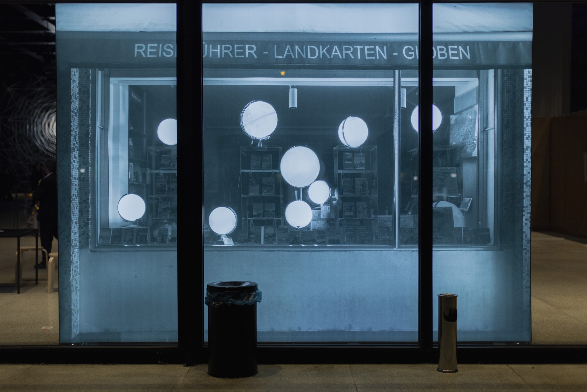 Der Laden ist dunkel, die Welt-Globen sind hell.