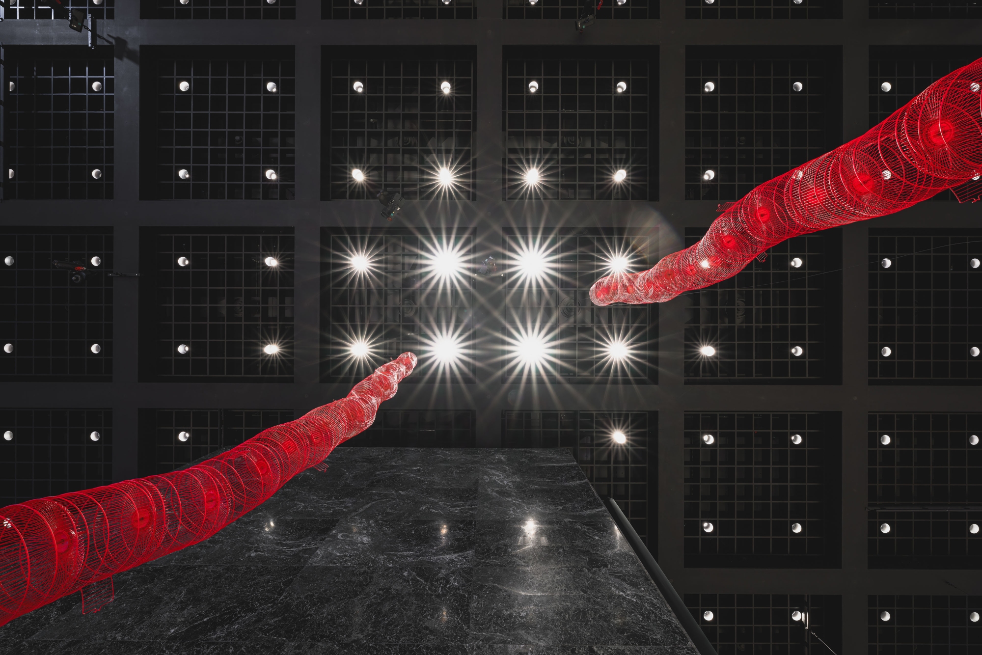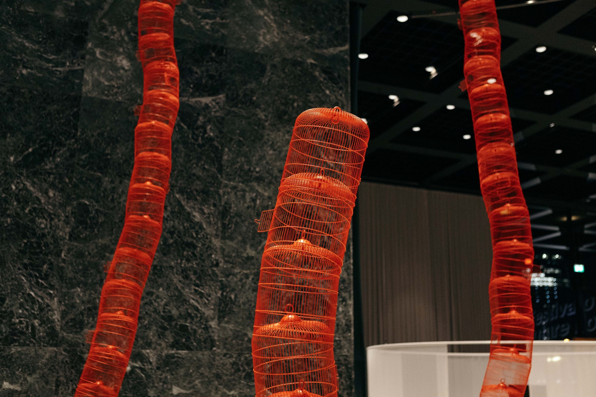 Nest consists of innumerable red birdcages stacked to form twisting structures. This sculpture by Euan Williams and Diana Thieme is the result of six years of fertility treatments and four years of parenthood. The cages look fragile, as if they could collapse at any moment. They evoke joyous associations but also call to mind imprisonment and a wish to be free. At the same time, they evoke a personal fate: cells that may or may not fuse, a slowly growing organism. The construction represents the challenge of looking after children and making it possible for them to lead happy lives.
