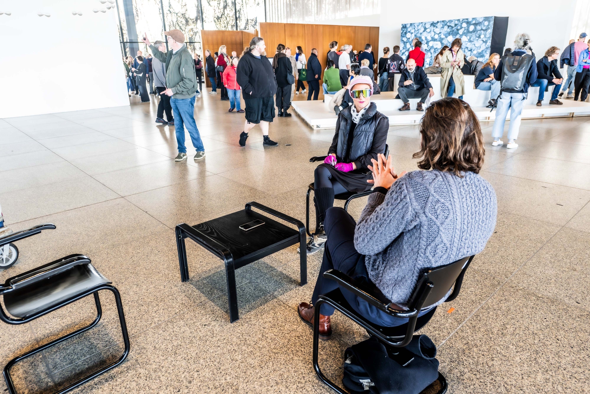 Die Performance von Vinzenz Reinecke erforscht das Potenzial zwischenmenschlicher Beziehungen. Drei Stühle und ein Tisch bilden die Bühne eines sozialen Experiments. Der Künstler nimmt in der Mitte Platz. Rechts von ihm sitzt eine ihm vertraute Person – etwa ein Freund oder Familienmitglied. Links sitzt jemand, den*die der Künstler nie zuvor getroffen hat. Das Publikum ist eingeladen, diesen Platz einzunehmen und teilzuhaben. Der Verlauf der Begegnung ist nicht vorgegeben: Es kann gesprochen, geschwiegen oder verweilt werden – so lange die Teilnehmenden das möchten.